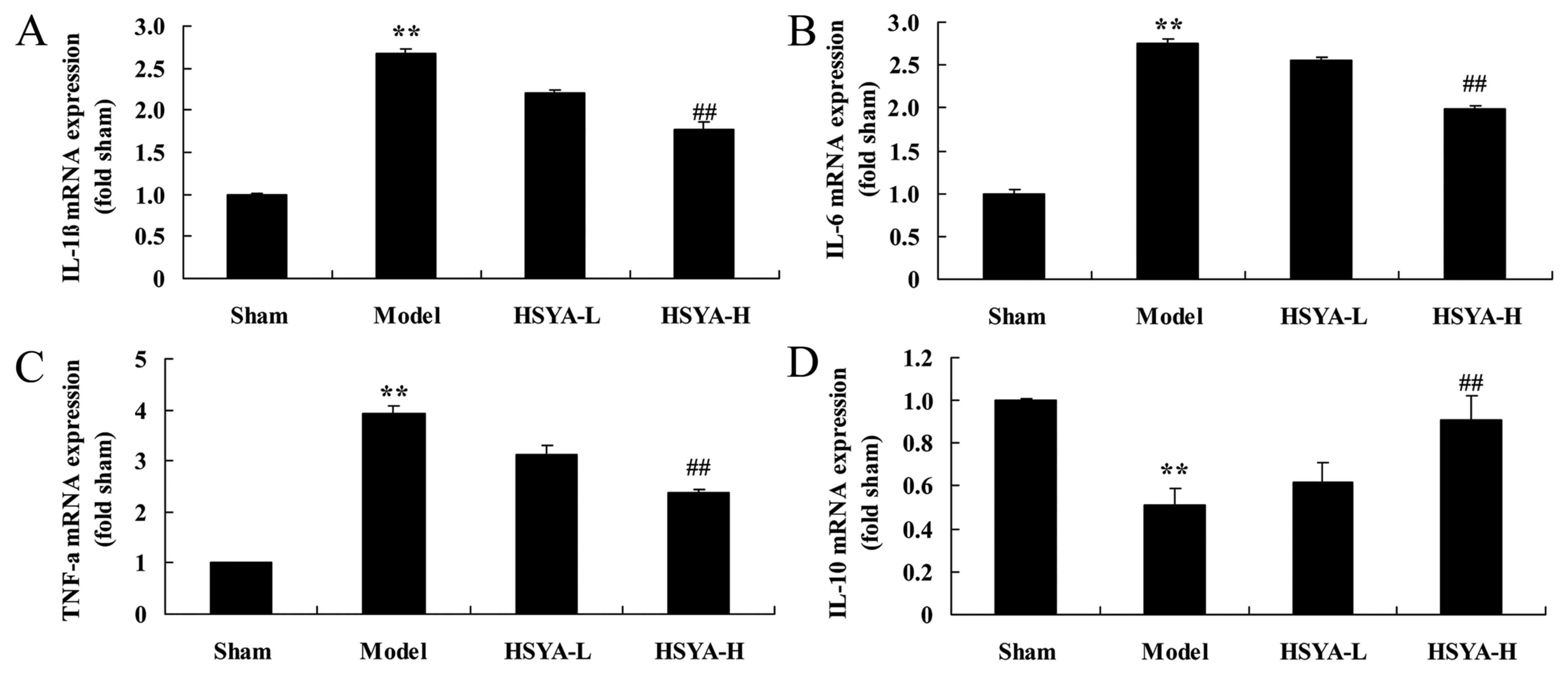 mRNA Levels of IL-1β, IL-6 and TNF-α were significantly higher in the model group compared with the sham group (all P<0.01; Fig. 4A-C), and IL-10 expression was significantly downregulated in the model group compared with the sham group (P<0.01; Fig. 4D). Treatment with high-dose HSYA significantly reversed the increase in IL-1β, IL-6 and TNF-α levels, and the decrease in IL-10 level in the model group (P<0.01; Fig. 4).