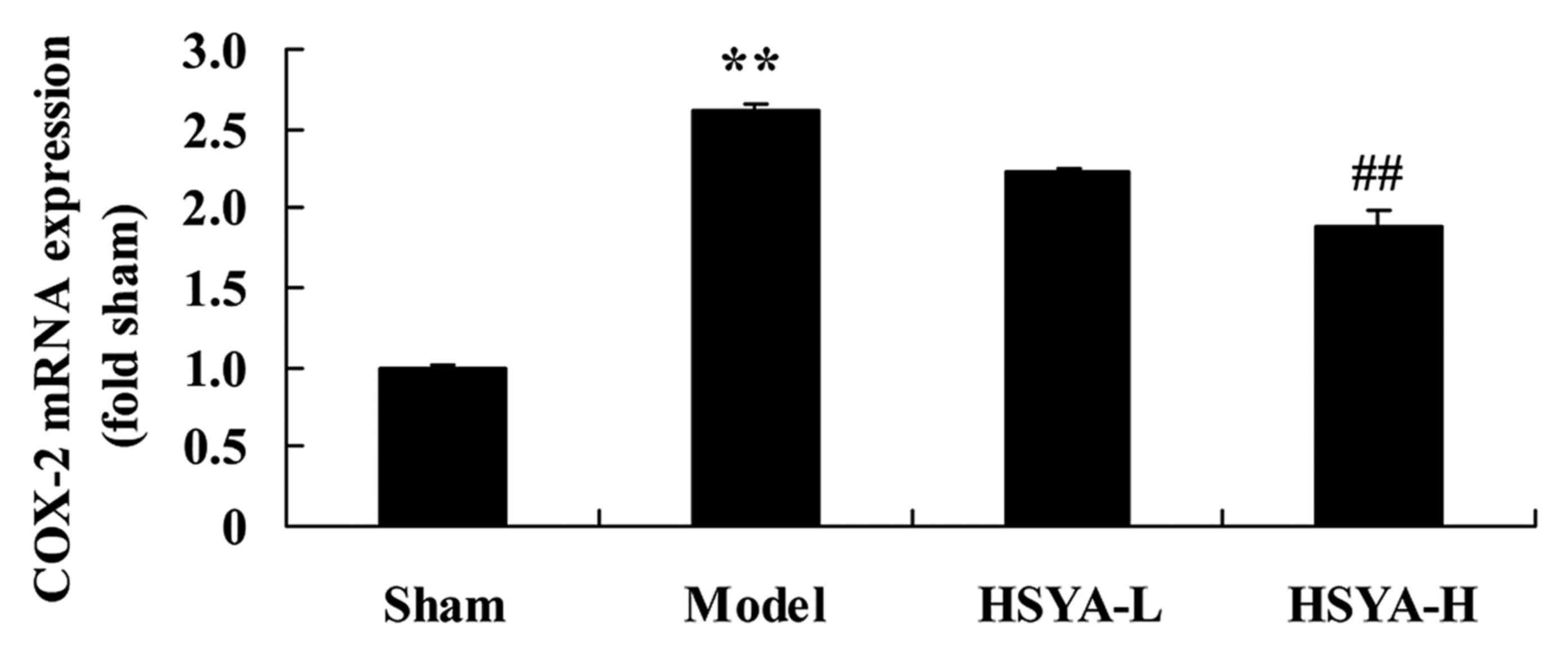 The results of RT-qPCR revealed that the expression of COX-2 mRNA was significantly higher in the model group compared with the sham group (P<0.01; Fig. 5). Treatment with high-dose HSYA, however, significantly suppressed the COX-2 mRNA levels in the model group (P<0.01; Fig. 5).