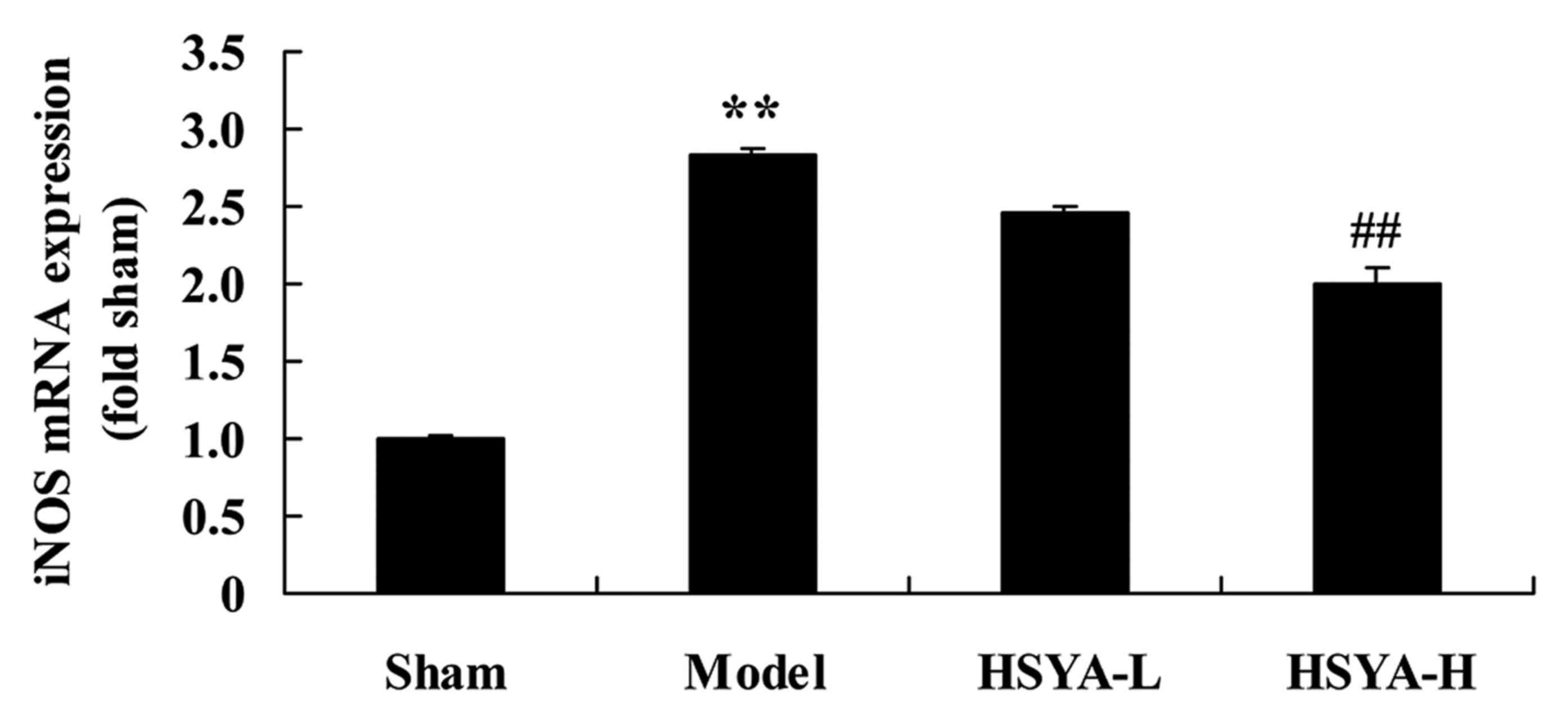 A significant increase was observed in levels of iNOS mRNA in the model group compared with the sham group (P<0.01; Fig. 6). The HSYA-H group exhibited a inhibited a significant downregulation in iNOS mRNA compared with the model group (P<0.01; Fig. 6).