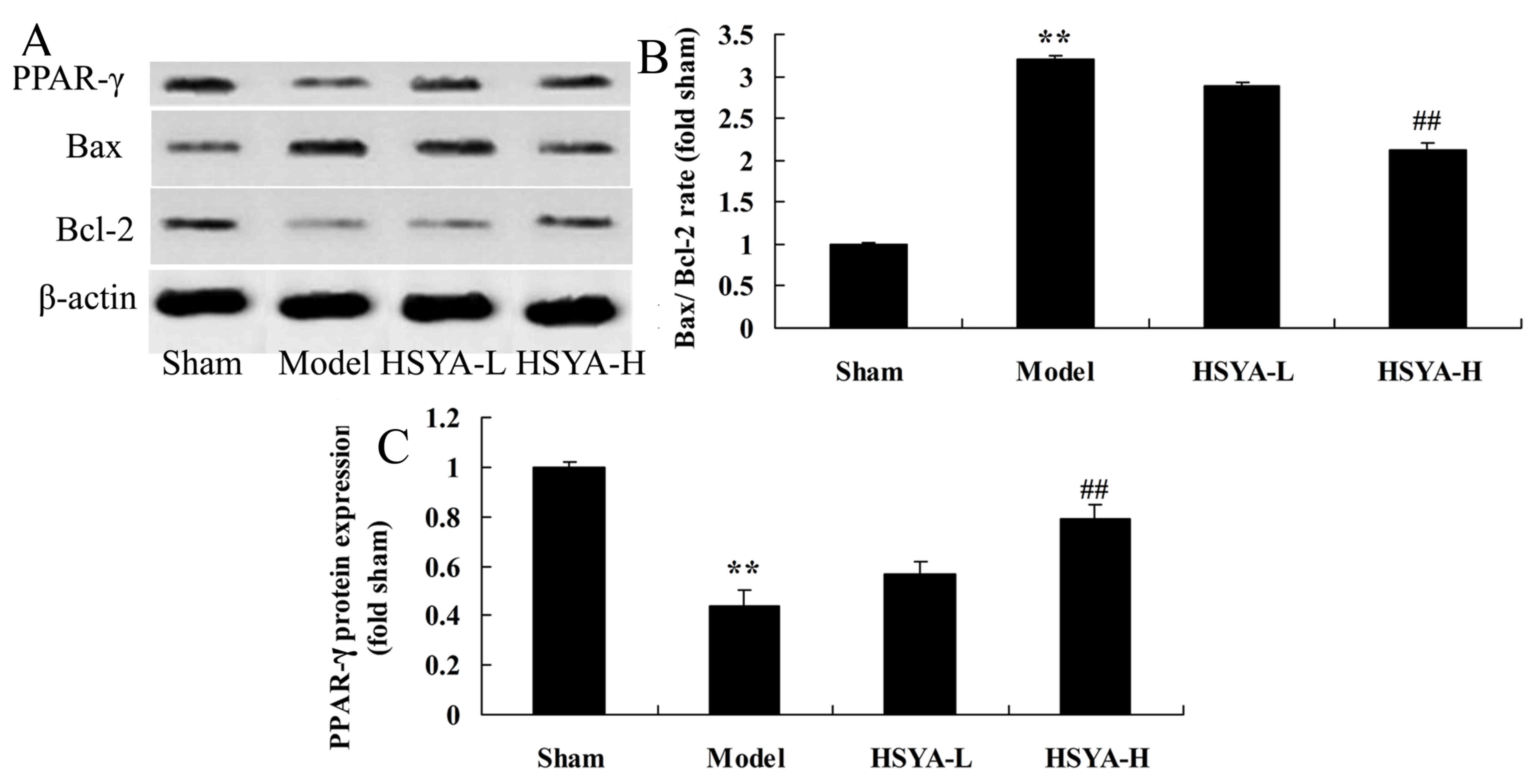 Results of western blot analysis revealed that the Bax/Bcl-2 ratio were significantly higher in the model group compared with the sham group (P<0.01; Fig. 7). The Bax/Bcl-2 ratio was significantly lower in the HSYA-H group compared with the model group (P<0.01; Fig. 7). PPAR-γ protein expression were significantly lower in the model group compared with the sham group (P<0.01; Fig. 7). However, PPAR-γ protein expression was significantly higher in the HSYA-H group compared with the model group (P<0.01; Fig. 7).