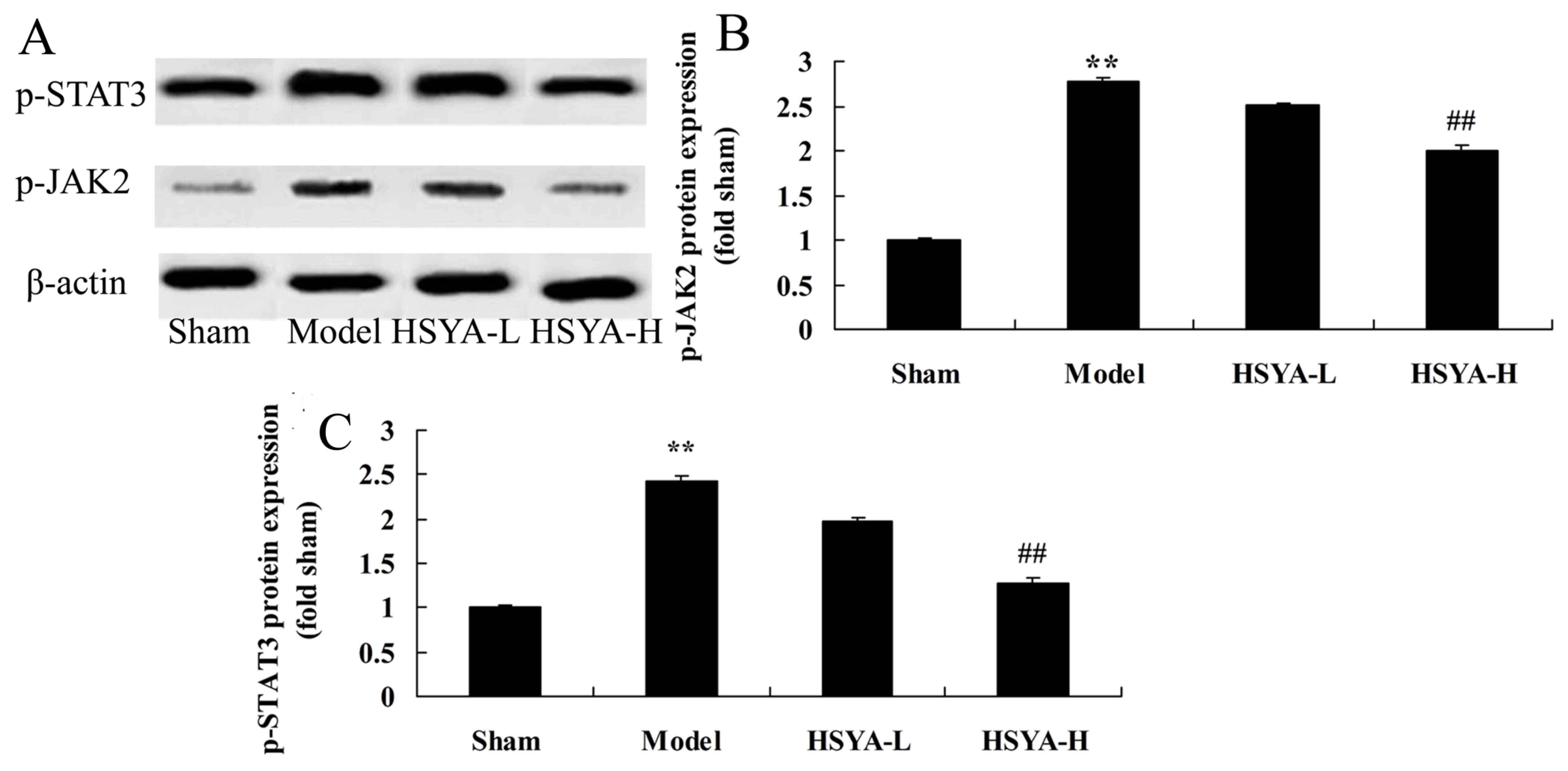 The results of western blot analysis revealed that p-JAK2 and p-STAT3 levels were significantly higher in the model group compared with sham group (P<0.01; Fig. 8). However, this increase was ameliorated by treatment with high-dose HSYA (P<0.01; Fig. 8).
