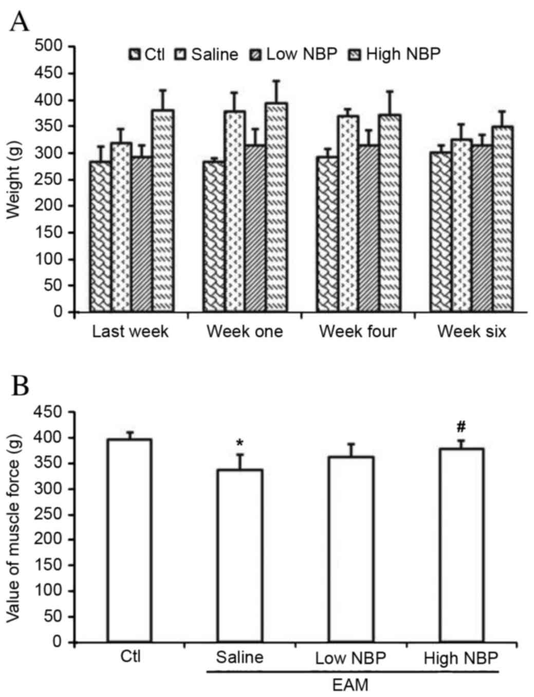 NBP has been reported to reduce cerebral infarction and neurologic impairment induced by diabetes (10). Taken orally, 30 mg/kg NBP only mildly improved the athletic ability of Tg (SOD1-G93A) transgenic rats (amyotrophic lateral sclerosis (ALS) animal model), but 60 mg/kg NBP significantly slowed the athletic ability in the ALS model (11). The present study demonstrated that loss of myodynamia in the EAM/normal saline group was restored in the EAM/high-dose NBP group, indicating that high-dose NBP restores the myodynamia of EAM animals.