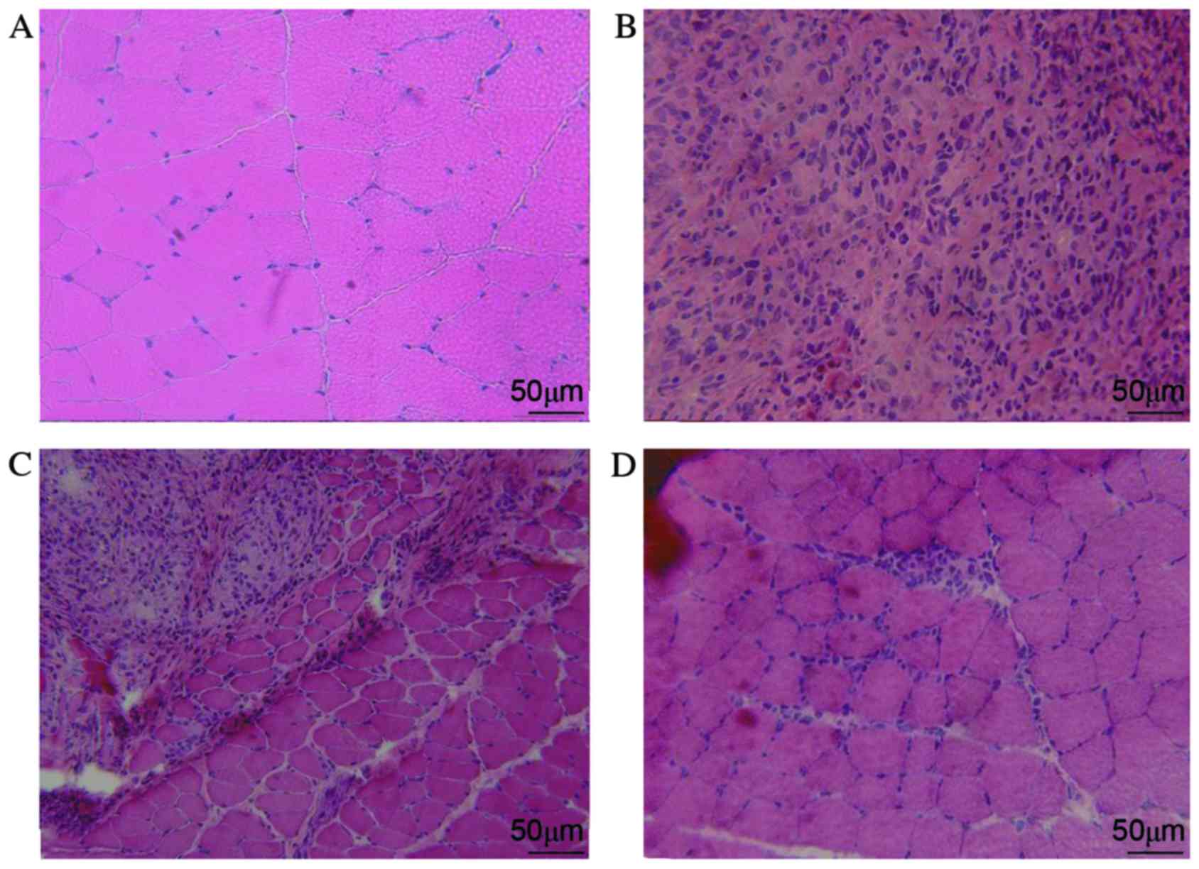 Idiopathic inflammatory myopathies (myositis for short) include dermatomyositis, PM, necrotizing myopathy and inclusion body myositis. Each type differs in the pathogenesis and clinical manifestation, but muscle biopsies are necessary for reliable diagnosis to distinguish PM from other types of myopathy. Clinically and pathologically, EAM is reflective of human PM, but PM is an extremely complex disease with varying pathology (6). In the present study, in the EAM/normal saline group, myodynamia was reduced but the inflammatory score was significantly higher than that in the control group, which indicates that the EAM model was successfully established.