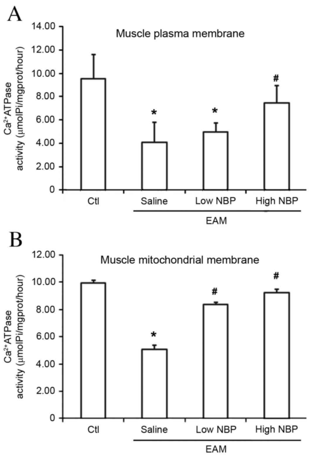 Cell membrane ATPases maintain the resting membrane potential and regulate the intracelluar and extracellular balance of calcium ions (40). In the muscle cell membrane and mitochondrial membrane, Ca2+-ATPase activity requires a concentration gradient across the membrane for cellular excitability. Intracellular K+ loss and extracellular Na+ inflow result in an increased muscle cell membrane depolarization threshold and decline in muscle capacity. Normal sodium calcium levels are reversed, which further increases the intracellular Ca2+ overload, activates proteolytic enzymes and promotes cell death (41). In the present study, intraperitoneal injection of high-dose NBP (80 mg/kg) led to a significant increase in Ca2+-ATPase activity in the guinea pig EAM model, which suggests that NBP protects the EAM mitochondria and the muscle plasma membrane. In the low-dose NBP group, no significant increase was observed in Ca2+-ATPase activity in the muscle plasma membrane, whereas activity was significantly increased in the muscle mitochondrial membrane.