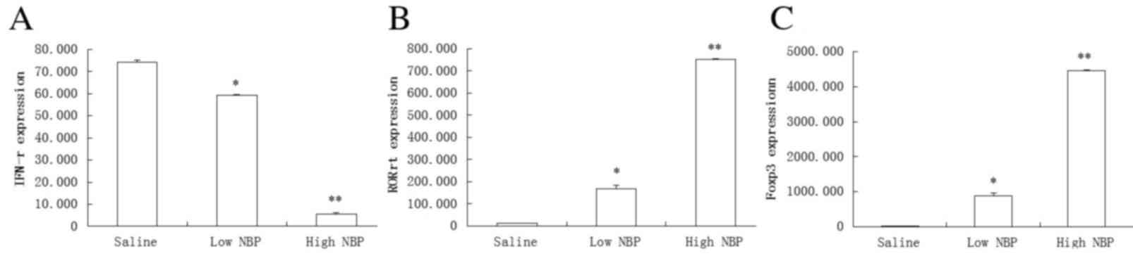 To determine the effects of NBP on T-cell-associated cytokines, the mRNA expression levels of IFN-γ, RORγt and Foxp3 in muscle tissues were measured. The expression of IFN-γ mRNA was significantly reduced by NBP (P<0.01; Fig. 6A), whereas Foxp3 and RORγt mRNA expression levels were significantly elevated by NBP (P<0.01; Fig. 6B and C).