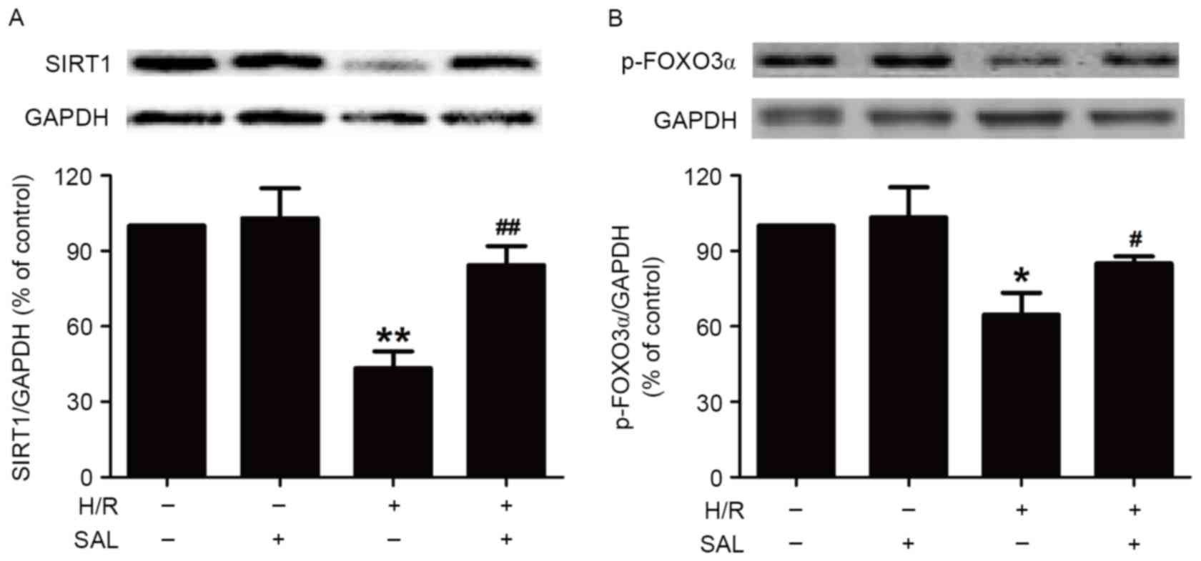 The present study therefore investigated whether SAL attenuates H/R injury, resulting in a neuroprotective effect, via regulation of the SIRT1/FOXO3α pathway. To the best of our knowledge, the current study is the first to investigate whether the SIRT1/FOXO3α signaling pathway contributes to the SAL-mediated prevention of H/R injury in vitro and may be a potential therapeutic target for the treatment of cerebral ischemic injury.