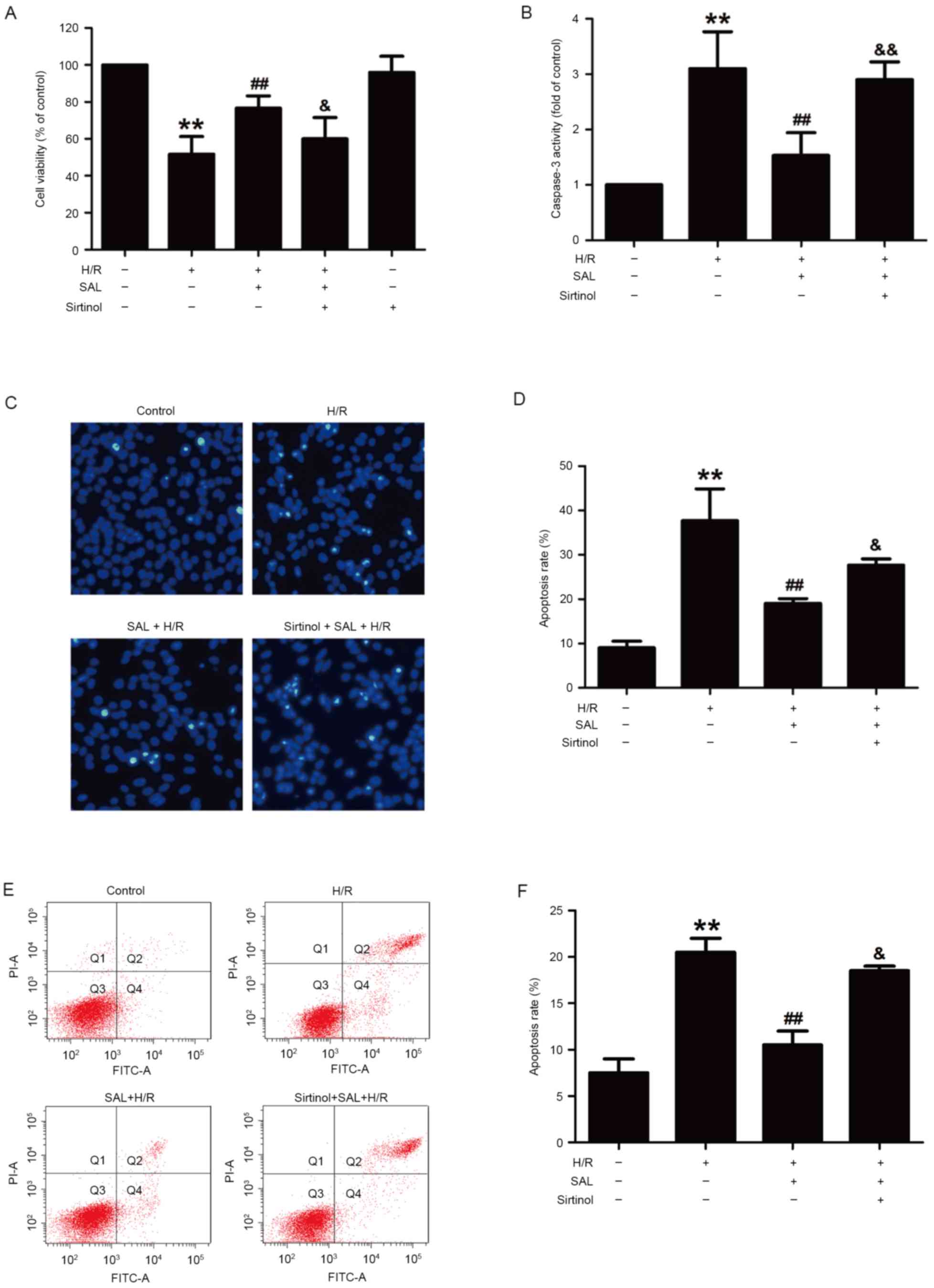 SAL, Sirtinol and 3-(4,5-cimethylthiazol-2-yl)-2,5-diphenyl tetrazolium bromide (MTT) reagent were purchased from Sigma-Aldrich; Merck KGaA (Darmstadt, Germany). Hoechst 33342 solution, the BCA protein assay kit, radioimmunoprecipitation (RIPA) lysis buffer and BeyoECL Plus were purchased from Beyotime Institute of Biotechnology (Shanghai, China). The caspase-3 enzyme-linked immunosorbent assay (ELISA) kit was purchased from the Nanjing Jiancheng Bioengineering Research Institute (cat no. H076; Nanjing, China). The Annexin V-fluorescein isothiocyanate (FITC)/propidium iodide (PI) staining kit was obtained from Sigma-Aldrich; Merck KGaA. Antibodies against SIRT1 (cat no. 9475), phosphorylated (p)-FOXO3α (cat no. 9466), B-cell lymphoma 2 (Bcl-2; cat no. 3498) and Bcl-2 associated X protein (Bax; cat no. 2772) were purchased from Cell Signaling Technology, Inc. (Danvers, MA, USA). GAPDH (cat no. 10494-1-AP) and secondary antibodies were obtained from ProteinTech Group, Inc. (Chicago, IL, USA).