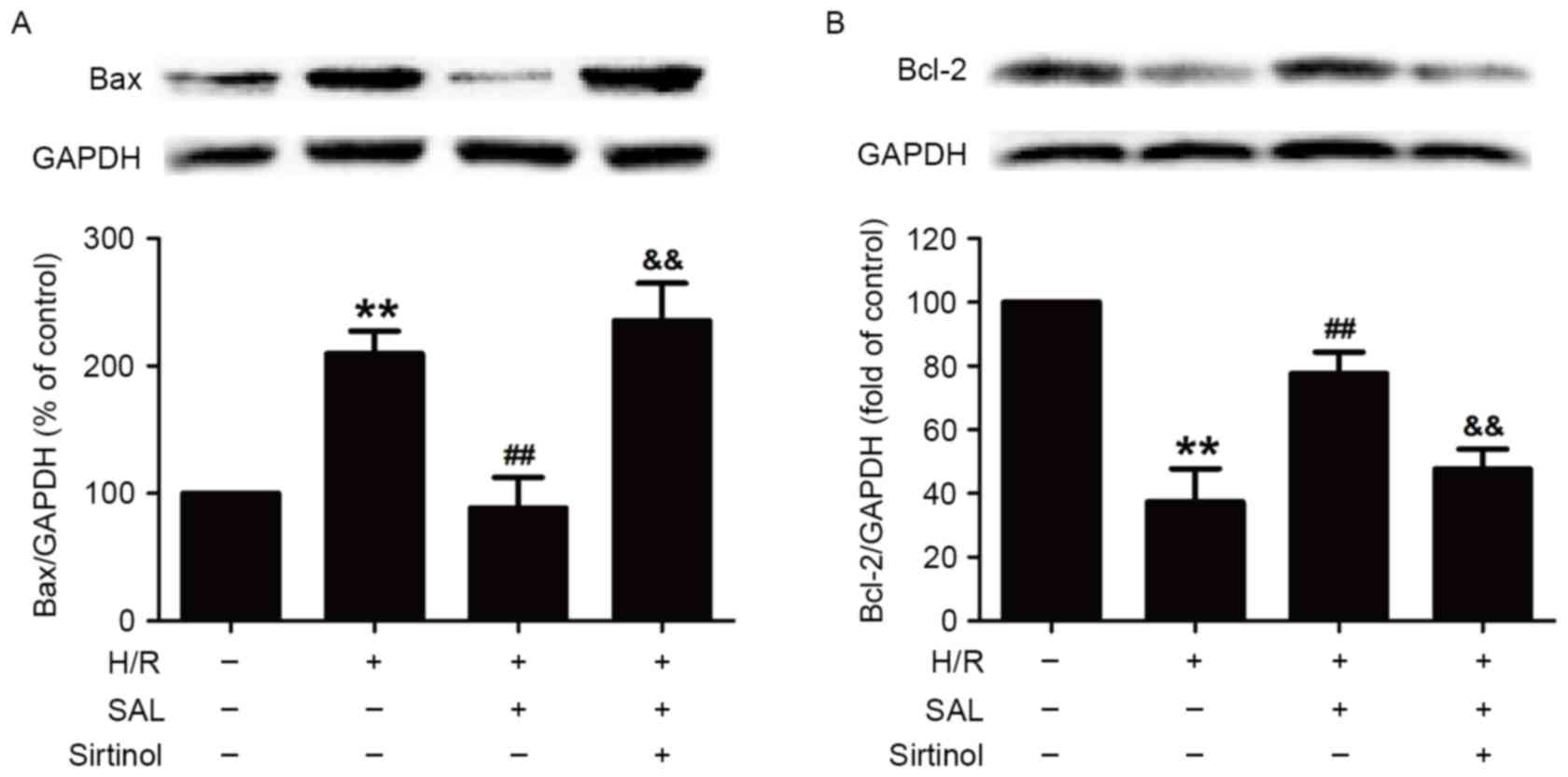 Finally, it was investigated whether the SIRT1/FOXO3α pathway was involved in the protective effect of SAL against the H/R-induced change in the expression of apoptosis-related proteins in HBVSMCs. Compared with the control group, H/R significantly increased the expression of the pro-apoptotic protein Bax (P<0.01) and this increase was reversed by pretreatment with SAL (400 µM; P<0.01; Fig. 5A). Notably, pretreatment with sirtinol (10 µM) significantly attenuated the SAL-induced downregulation of Bax expression in HBVSMCs compared with SAL and the H/R co-incubation group (P<0.01; Fig. 5A). Additionally, the significant decrease in the expression of the anti-apoptotic protein Bcl-2 induced by H/R was also significantly attenuated by SAL pre-treatment (400 µM; P<0.01; Fig. 5B). However, sirtinol reversed the SAL-induced increase in Bcl-2 expression (P<0.01; Fig. 5B). These results demonstrate that the SIRT1/FOXO3α pathway mediated the inhibitory role of SAL in H/R injury and may be involved in promoting the expression of proteins in the Bcl-2 family.