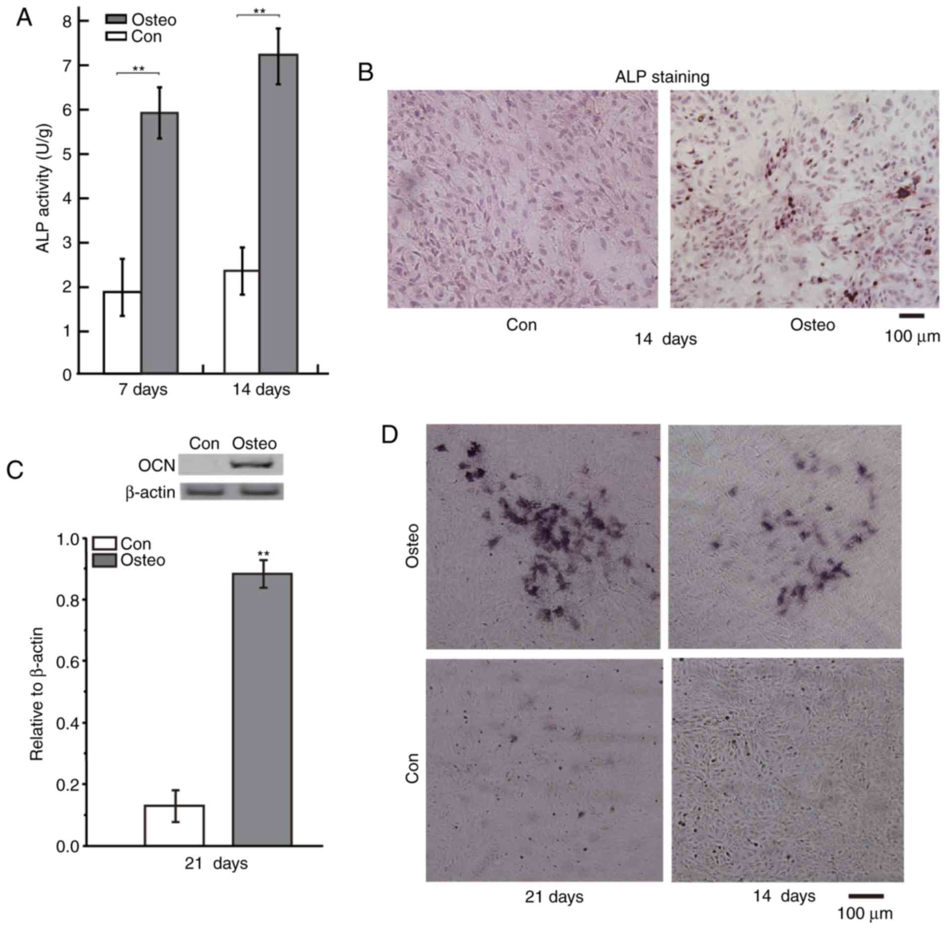 The effect of osteoinductive medium on the differentiation of osteoblasts was investigated via measuring various markers of osteoblastic differentiation, including ALP, calcium deposits and OCN levels (Fig. 1). Following exposure of the BMSCs to osteoinductive medium, the ALP activities in BMSCs which were induced for 7 days and 14 days were notably higher than that in control group (Fig. 1A). Protein levels of OCN were also increased in BMSCs which were induced for 21 days (Fig. 1C). In addition, the images of ALP and Alizarin red-S staining of BMSCs indicated that the osteoinductive medium increased the levels of ALP and calcium deposits in the BMSCs at indicated time (Fig. 1B and D). ALP, OCN, and calcium deposits are all markers of osteoblastic differentiation (19–22). Therefore, the osteoinductive medium promoted osteoblastic differentiation of the BMSCs.