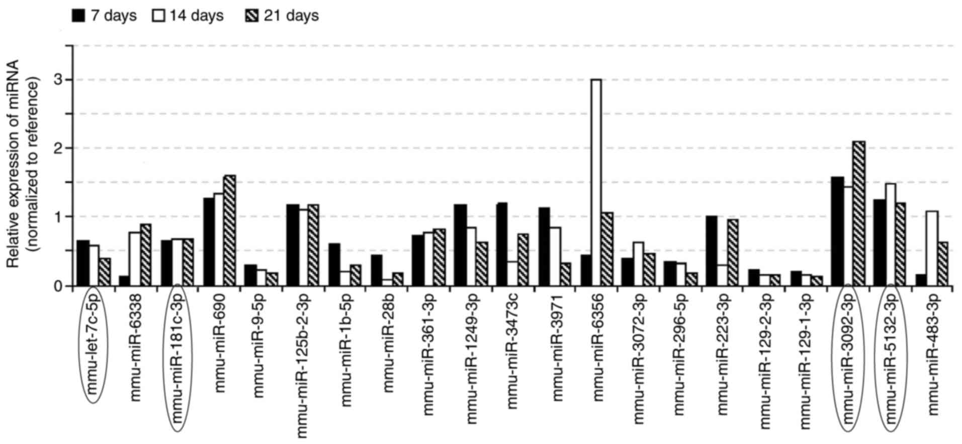 To identify differentially expressed miRNAs among the groups, Student's t-test was performed using SPSS 18.0 (SPSS, Inc., Chicago, IL, USA). The experiments were repeated in triplicate. Statistical significance between the groups was measured using Student's t-test; P<0.05 was considered to indicate a statistically significant difference.