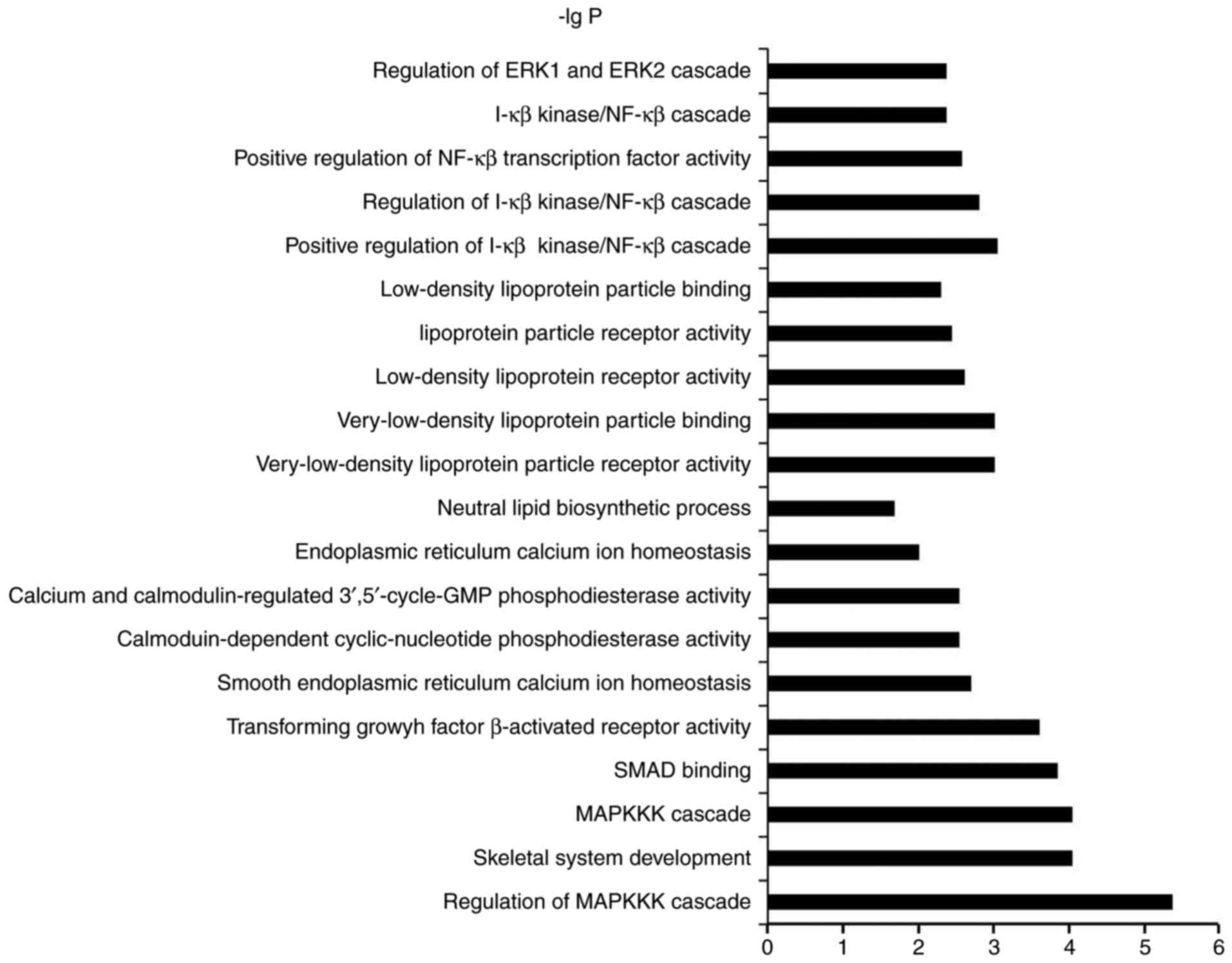 To identify the biological functions of these genes, GO and pathway enrichment analysis were performed, respectively. All the GO/KEGG annotation results in pathways and molecular functions related to osteogenic differentiation or bone formation were searched to excavate functions related genes. As illustrated in Fig. 4 and Table IV, the top 20 GOs sensitive to osteoinductive medium were showed in Fig. 4. In the result of KEGG, three items with minimum P-value were selected from the statistical results of the data, showed in Table IV.