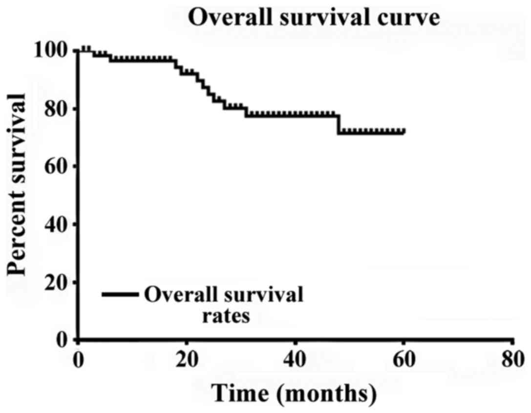 All of the 215 patients were followed up, and the 5-year follow-up rate was 100%. There were 16 cases of survival without tumor, 10 cases of survival with tumor and 41 cases of death, among which 21 cases died of laryngeal cancer recurrence, 2 cases died of lung metastasis, 1 case died of cervical metastasis, 4 cases died of heart disease and 13 cases died due to unknown causes. The 1-, 3- and 5-year survival rates were 96.2, 78.0 and 72.5%, respectively, and the survival curve is shown in Fig. 1.