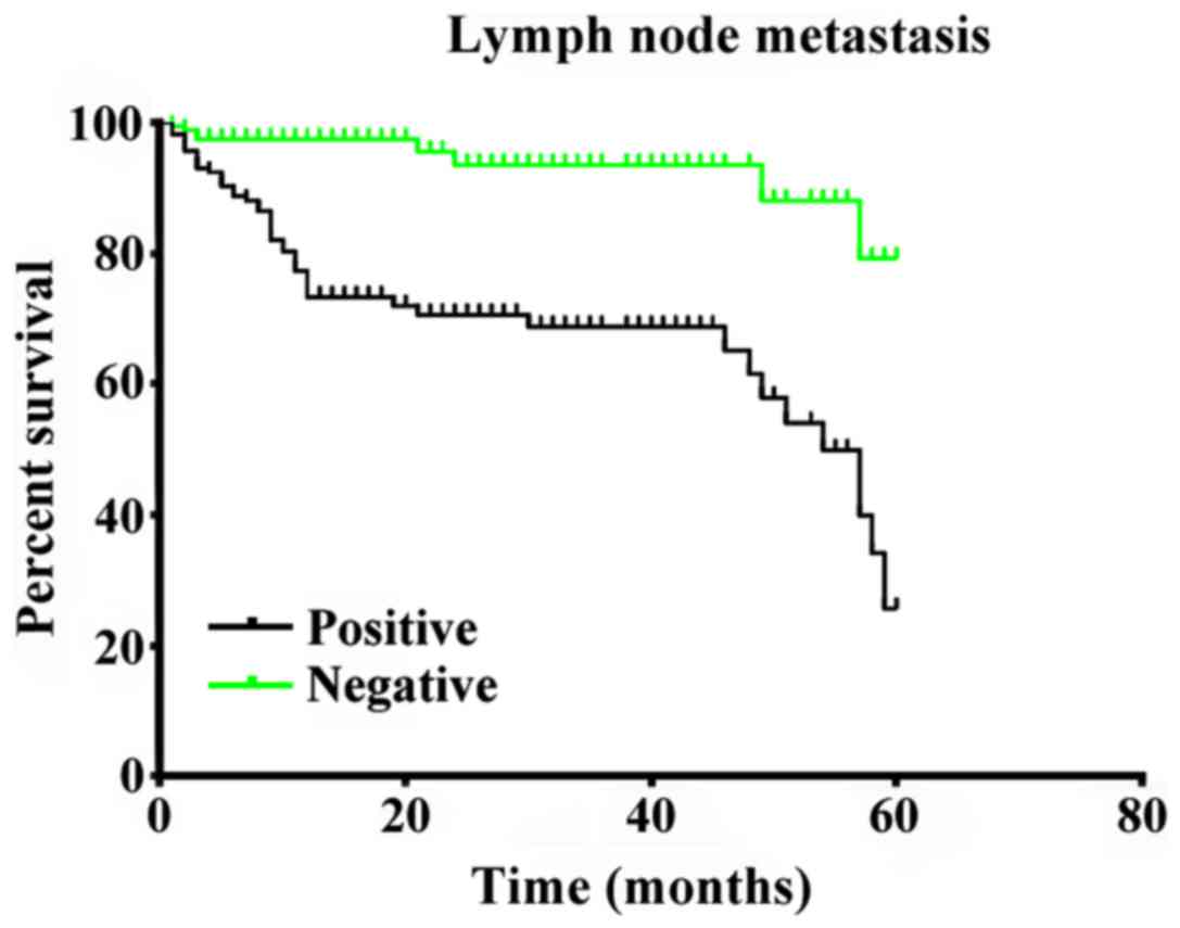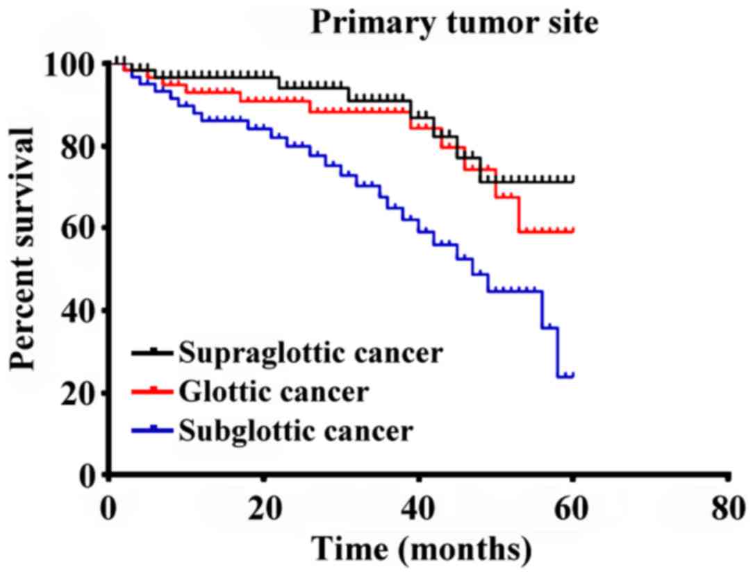 Cox proportional hazard regression model was used for multiple-factor analysis with the age, primary tumor site, tumor differentiation degree, T stage, N stage, smoking index, tumor diameter and lymph node metastasis in the single-factor analysis were included, and the results showed that the primary tumor site, T stage, N stage and lymph node metastasis were the independent risk factors affecting the surgical effect on patients with laryngeal cancer (P<0.05) (Table II). In order to show the difference in survival rate among the four independent prognostic factors, the survival curves were drawn (Figs. 2–5).