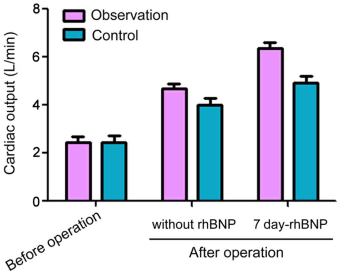 The rapid development of economy and the improvement of people's living standards allow more patients to accept heart surgery for the improvement of quality of life including the heart valve repair or replacement, cardiac surgery and coronary artery bypass grafting (1). The preoperative cardiac reserve functions of patients before the heart surgery are usually poor. Further, the surgical trauma, intraoperative myocardial ischemia and CPB are also prone to myocardial ischemia as well as ischemia reperfusion injury leading to low cardiac output syndrome (2,3). Therefore, it is very important to strengthen the protection of cardiac functions and prevention of the myocardial damage in patients undergoing cardiac surgery. This process would play an important role in improving the success rates of surgery and prognosis (4). Brain natriuretic peptide is a member of natriuretic peptide family. Recombinant human brain natriuretic peptide (rhBNP) is a kind of medicine for the treatment of heart failure, and is a recommended drug for acute as well as chronic heart failure (5). The related research showed that rhBNP has the ability to maintain the normal cardiac output, dilation of the pulmonary circulation/coronary circulation, reduction in cardiac load, protection of ischemic myocardium (5). Moreover, it could also achieve good clinical effects on heart functions after cardiac surgery (5). In the present study, patients were treated with the combination of routine treatment with recombinant human brain natriuretic peptide (rhBNP) after open-heart surgery and the clinical potential of this combination was evaluated.
