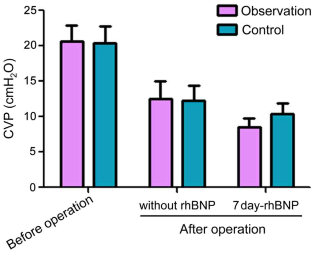 The postoperative CO, PAWP and CVP indicators of the two groups of patients were significantly improved and the observation group was significantly better than the control group after 7 days of treatment (P<0.05). The above observation could be justified in the light of the fact that the natriuretic peptide has balanced expansion arteriovenous/coronary artery diastolic function (14). A related study also showed improvements in the hemodynamic parameters after 15 min of treatment (15). The natriuretic peptide could improve the heart rate through the comprehensive effect (16). The results of this study showed that postoperative LVEF were higher than preoperative in the two groups of patients, and the observation group was significantly higher than the control group after 7 days of treatment (P<0.05). Moreover, natriuretic peptide has ability to directly affect myocardial cells, thereby reducing myocardial oxygen consumption, with inhibition of excessive stress reaction of the circulatory system, so as to have a protective effect on the heart (17,18).