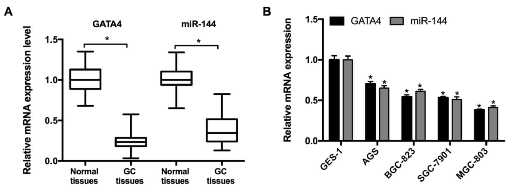 The dysregulation of microRNAs (miRNAs/miRs) may serve oncogenic or tumor suppressor functions in tumorigenesis, as miRNAs regulate cell proliferation, apoptosis, migration and invasion (9). Previous studies have suggested that miRNAs may be used as molecular biomarkers in the diagnosis and prognosis of GC (10–12). Oncogenic miRNAs, which are generally upregulated in GC, exert their function by silencing the expression of genes that inhibit the cell cycle and/or genes associated with apoptotic pathways (13–15). By contrast, miRNAs that are downregulated act as tumor suppressors during GC progression. These miRNAs generally exert their function via anti-proliferative and pro-apoptotic associated genes (14–16). Additionally, decreased levels of miR-144 in GC tissue may be associated with poor patient prognosis and it was demonstrated that the reintroduction of miR-144 increased the susceptibility of cancer cells to chemotherapy (17,18). It has been reported that GATA4, a key regulator of cardiogenesis via cell autonomous or non-autonomous mechanisms, may be involved in the activation of miR-144 (19,20). Furthermore, the ability of miR-144 to inhibit the proliferation and metastasis of tumor cells is dependent on the target genes involved (21). Thus, the present study aimed to determine the role of miR-144 in GC tissues.