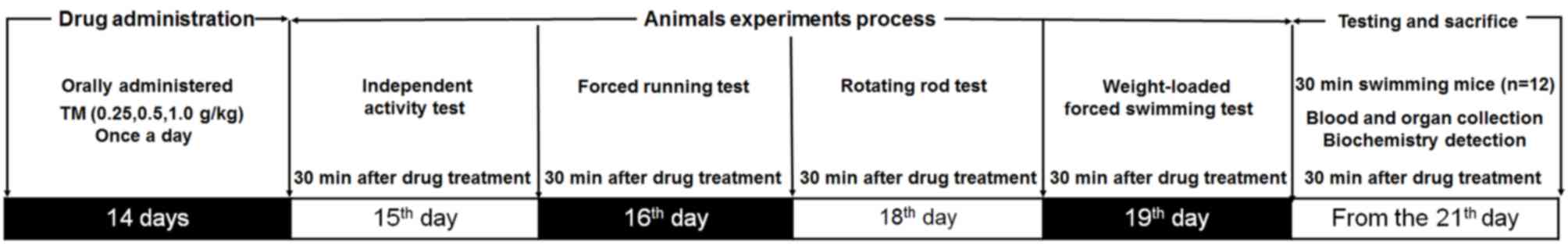 Following 1 week adaptation, mice were randomly divided into 4 equal groups (n=24; consisting of equal numbers of males and females). Mice underwent treatment for a total of 21 days and were either orally treated with physiological saline (control, 0.01 ml/g) or TM at doses of 0.25, 0.5 or 1.0 g/kg once a day. Doses and administration routes of TM were selected based on previous studies (14). The experimental protocol and drug administrations are presented in Fig. 1.