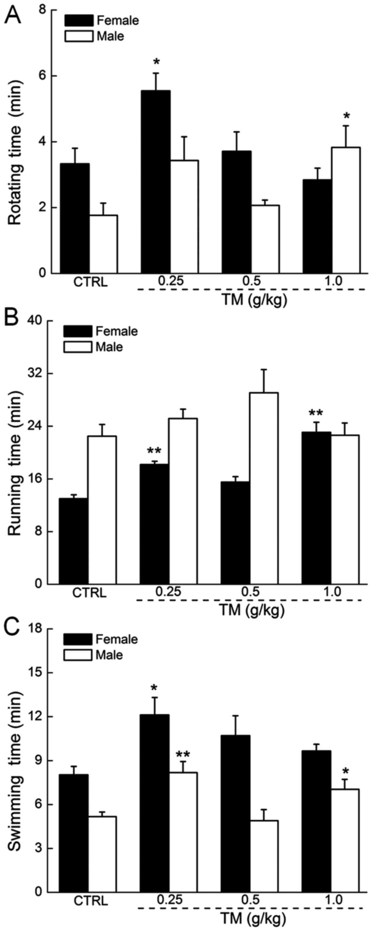 TM administration did not significantly affect the body weights of mice (Table I). In the rotating rod test, TM at 0.25 g/kg caused a 67% increase in the rotating time in female mice and TM at 1.0 g/kg caused a 117% increase in the rotating time in male mice, which were each significantly increased compared with the control group (P<0.05; Fig. 2A). In the forced running test, no significant increase in the exercise times of male mice was observed following TM treatment. In contrast, TM at a dose of 0.25 and 1.0 g/kg resulted in a 40 and 78% increase in the running times of female mice, which was significantly increased compared with the control group (P<0.01; Fig. 2B). Treatment with 0.25 g/kg TM improved the swimming times of female and male mice by 51 and 58%, respectively, which were significantly increased compared with the control group (P<0.05 and P<0.01; Fig. 2C). Additionally, treatment with TM did not influence the horizontal and vertical movements of female or male mice included in the independent activity tests (data not shown).