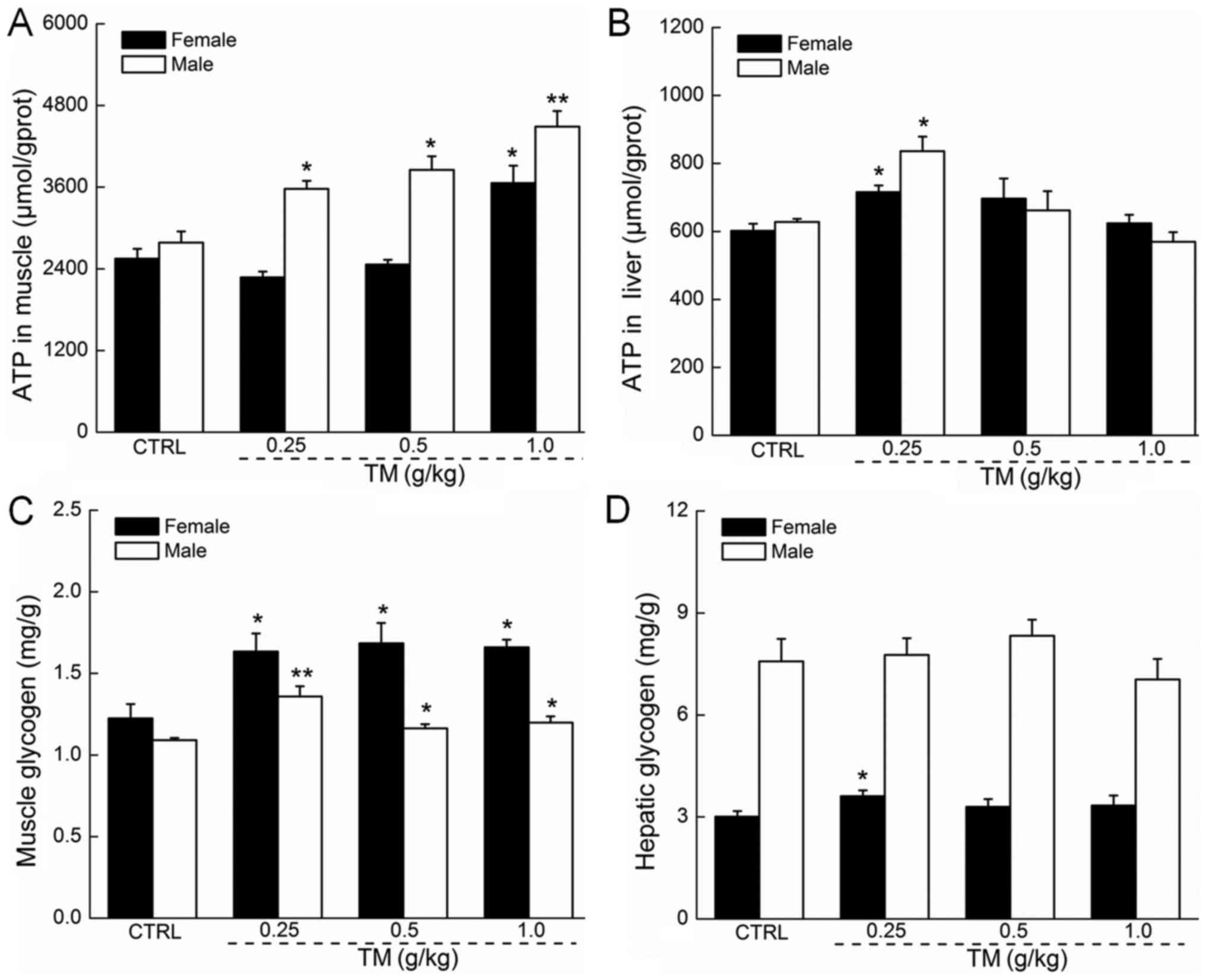 Glycogen is the predominant source of energy during exercise, and its depletion may be a primary element for the development of physical fatigue (24). A shortage of hepatic glycogen may severely impair nervous function (25). Male and female mice treated with TM following 30 min forced swimming exhibited significantly increased MG concentration in all doses, compared with the control (P<0.05 and P<0.01; Fig. 3C). TM administration did not significantly affect hepatic glycogen levels in male and female mice. However, female mice treated with TM exhibited increased hepatic glycogen concentration of ~20% compared with controls (P<0.05; Fig. 3D).