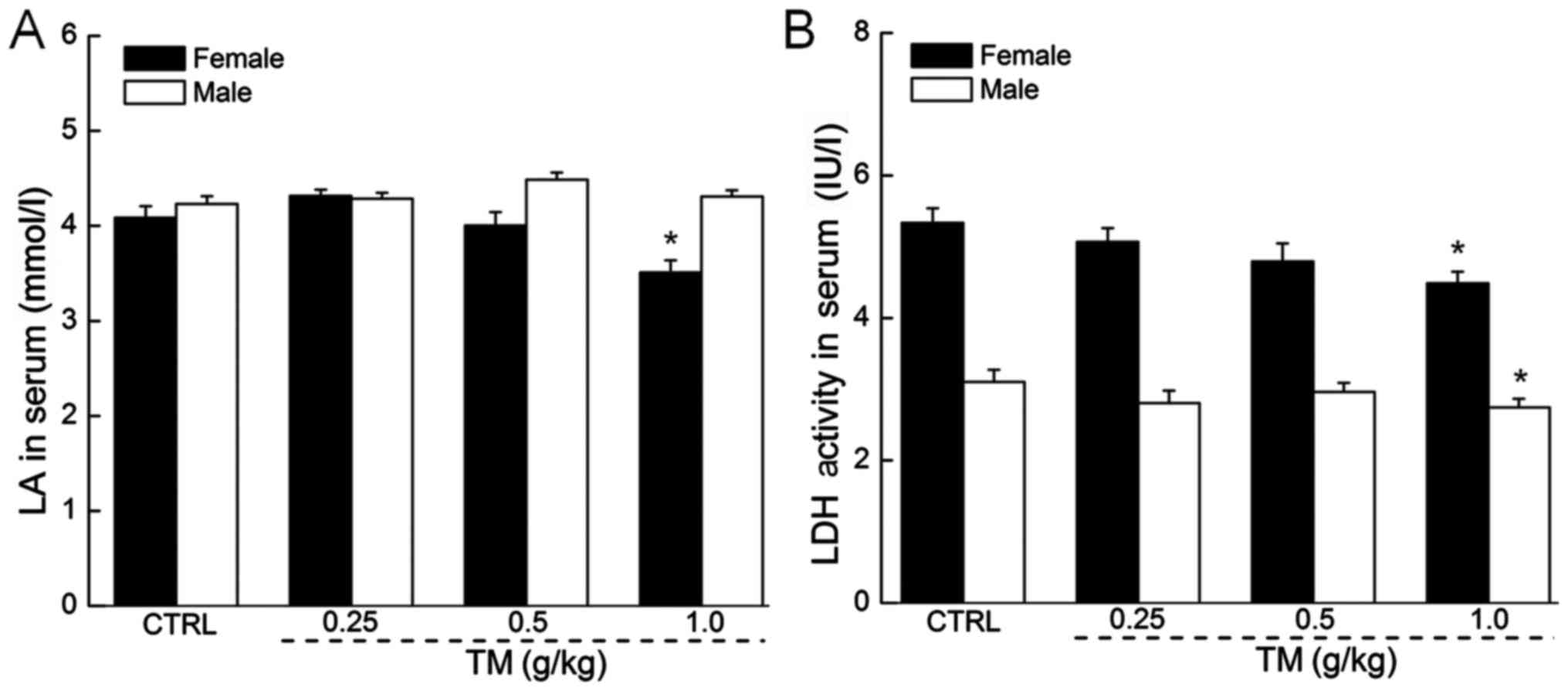 In anaerobic conditions, LA accumulates and affects the ability of an individual to maintain intense exercise (26). Only female mice treated with 1.0 g/kg TM exhibited significantly reduced LA serum levels compared with the control (3.5 mmol/l vs. 4.1 mmol/l; P<0.05; Fig. 4A). Other doses of TM did not significantly affect LA serum levels in females. LA serum levels in males remained unchanged following treatment with all doses of TM. In addition, excessive quantities of LDH serve as an indicator of muscle damage (27). Following 30 min exercise, a 14-day treatment of 1.0 g/kg TM reduced serum LDH levels by 15.9 and 11.4% in female and male mice respectively compared with the control (both P<0.05; Fig. 4B). Other doses of TM did not significantly affect LDH levels in male or female mice.