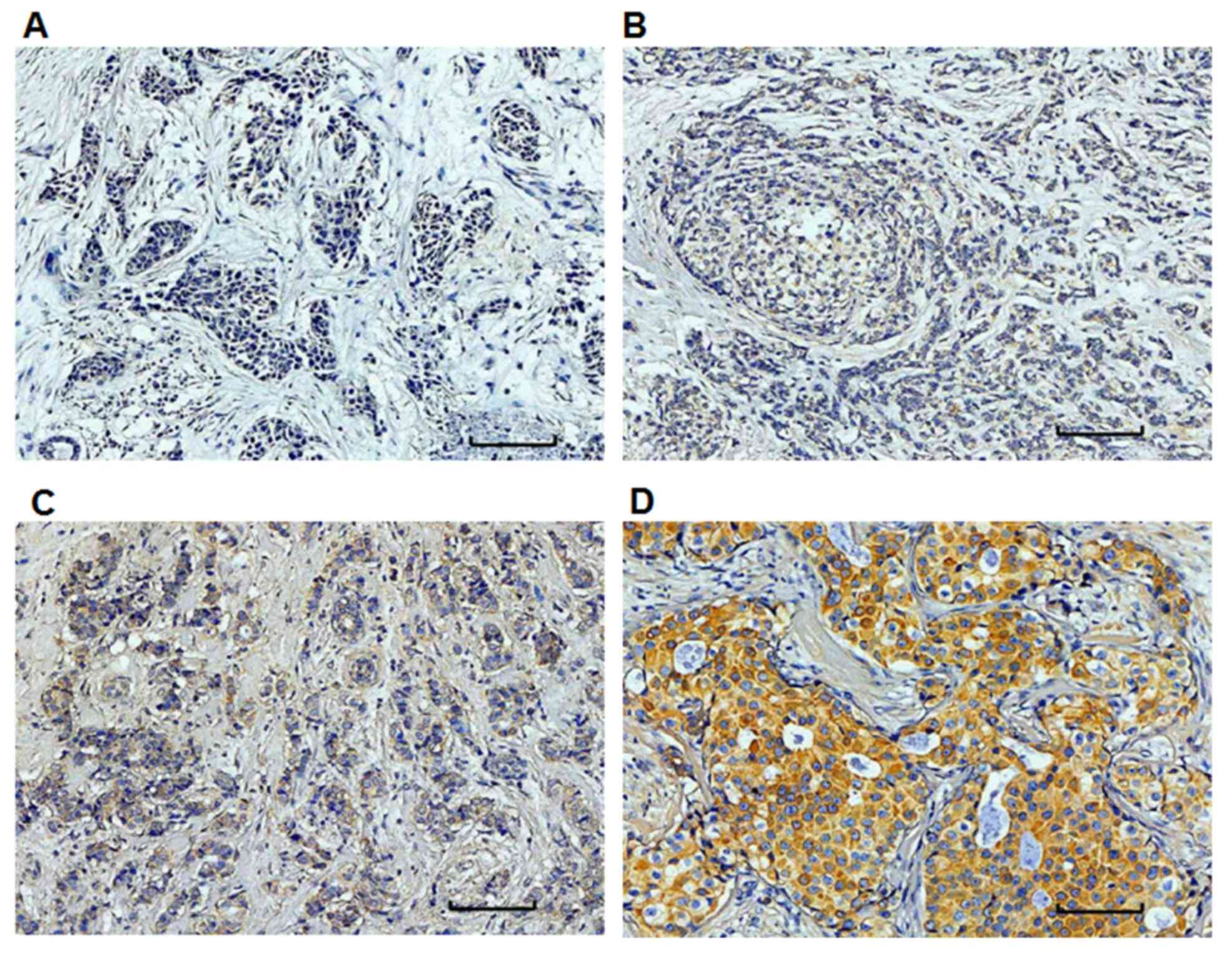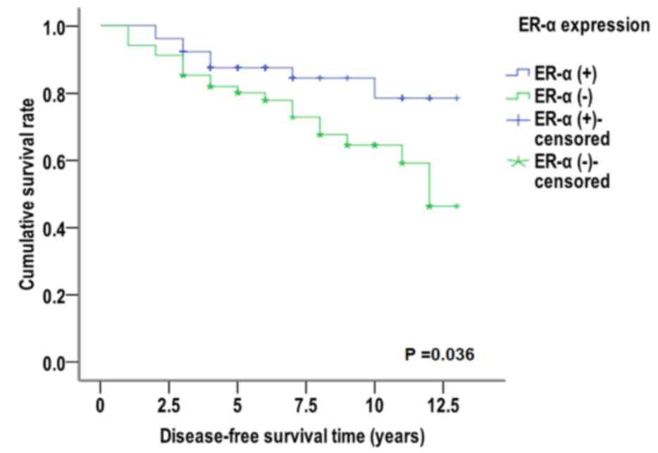 Table I.Relationship between miR-10b expression and ER-α, PR and Her-2 expression in early breast invasive ductal cancer. |