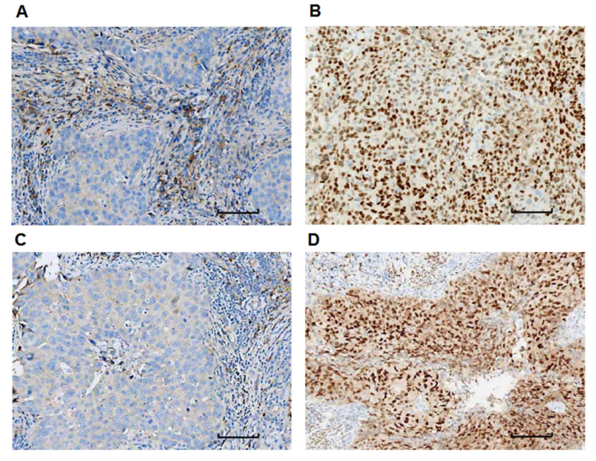 To detect the expression levels of ER-α and PR, immunohistochemistry was performed. From the 193 patients, 110 were ER-α (+), 83 were ER-α (−), 133 were PR (+) and 60 were PR (−) (Table I). Fig. 2 depicts representative staining images of tumor samples obtained from patients. Tumor samples with a positive staining rate of ≤10% (ER-α- or PR-negative; Fig. 2A and C) and >10% (ER-α- or PR-positive; Fig. 2B and D) were identified.