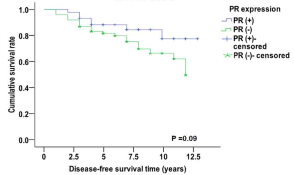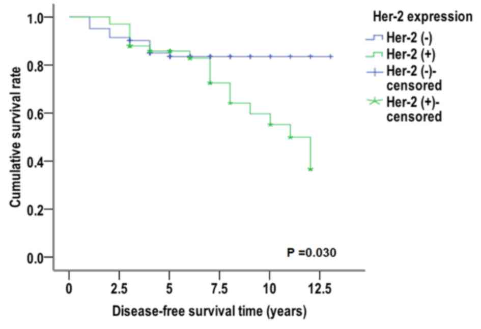 Cumulative disease-free survival analysis was performed using the Kaplan-Meier method and Log-rank test. In tumor samples that were identified as miR-10b (+), the median disease-free survival (50% of the cumulative survival rate) time was significantly increased in patients that were ER-α (+) (11.466 years) compared with patients that were ER-α (−) (9.994 years; χ2=4.375, P=0.036; Fig. 4). Similarly, the median disease-free survival free time was increased in patients that were miR-10b (+) and PR (+) (11.509 years) when compared with patients that were PR (−) (9.773 years; χ2=2.883, P=0.090; Fig. 5). Conversely, in patients that were miR-10 (+) and Her-2 (−), the median disease-free survival time was 11.346 years, which was significantly increased compared with patients that were Her-2 (+) (9.481 years) (χ2=4.704, P=0.030, Fig. 6). For patients with miR-10b (−), miR-10b (−) expression had no effect on the median disease-free survival time of different breast cancer molecular subtypes (data not shown). These results suggest that miR-10b-positive expression resulted in different expression levels of PR, which has no significant effect on the disease-free survival curve of patients; however, for miR-10b-positive expression, different expression levels of ER-α and Her-2 may have a significant effect on the disease-free survival curve of patients.