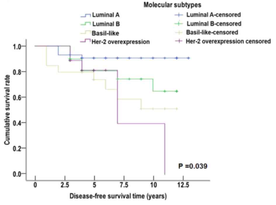 Patients that were miR-10b (+) with early invasive ductal carcinoma were divided into several molecular subtypes. These subtypes consisted of luminal A, luminal B, Her-2 overexpression and basal-like subtype. The Kaplan-Meier method and Log-rank test were used to perform survival analysis. The median disease-free survival time was 12.035 years for luminal A subtype, 9.882 years for luminal B subtype, 8.024 years for Her-2 overexpression subtype and 8.316 years for basal-like subtype. The median disease-free survival time of patients that were miR-10b (+) was significantly decreased in the Her-2 overexpression and basal-like subtypes compared with luminal A subtype (χ2=8.340, P=0.039; Fig. 7). These data suggested that the positive expression of miR-10b was correlated with the median disease-free survival time of different molecular subtypes.