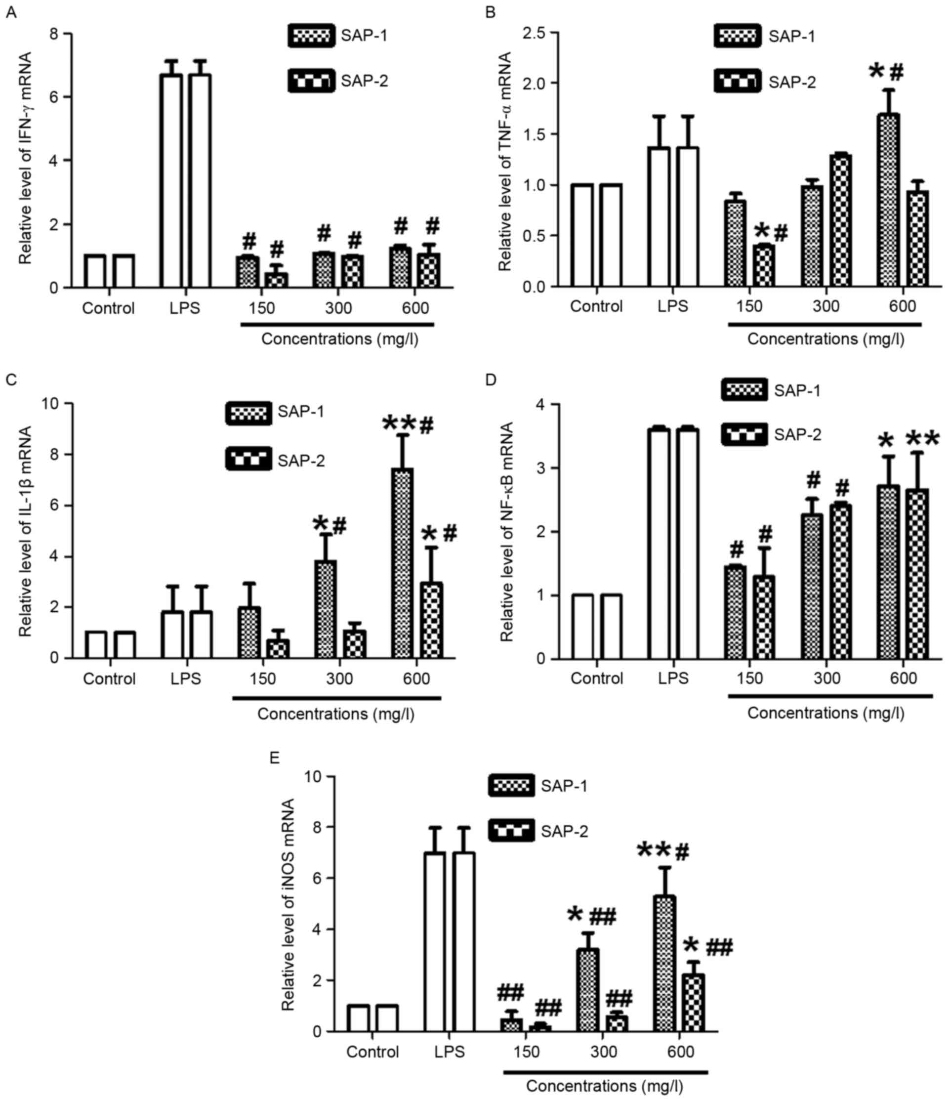 RT-qPCR was employed to measure the mRNA expression of IFN-γ, TNF-α, IL-1β, NF-κB and iNOS. The data revealed that treatment with all concentrations of SAP-1 or SAP-2 had no effect on the IFN-γ mRNA level compared with the control (P>0.05), but IFN-γ mRNA levels in all SAP-1 or SAP-2 concentration groups were significantly lower than those in the LPS group (P<0.05; Fig. 7A). The level of TNF-α mRNA in the high SAP-1 concentration group was significantly higher compared with those in the control and LPS groups (both P<0.05). In addition, the level of TNF-α mRNA in the low SAP-2 concentration group was significantly lower than those in the control and LPS groups (both P<0.05). For other concentrations of SAP-1 or SAP-2, the levels of TNF-α mRNA were not significantly different from either control or LPS values (P>0.05; Fig. 7B).