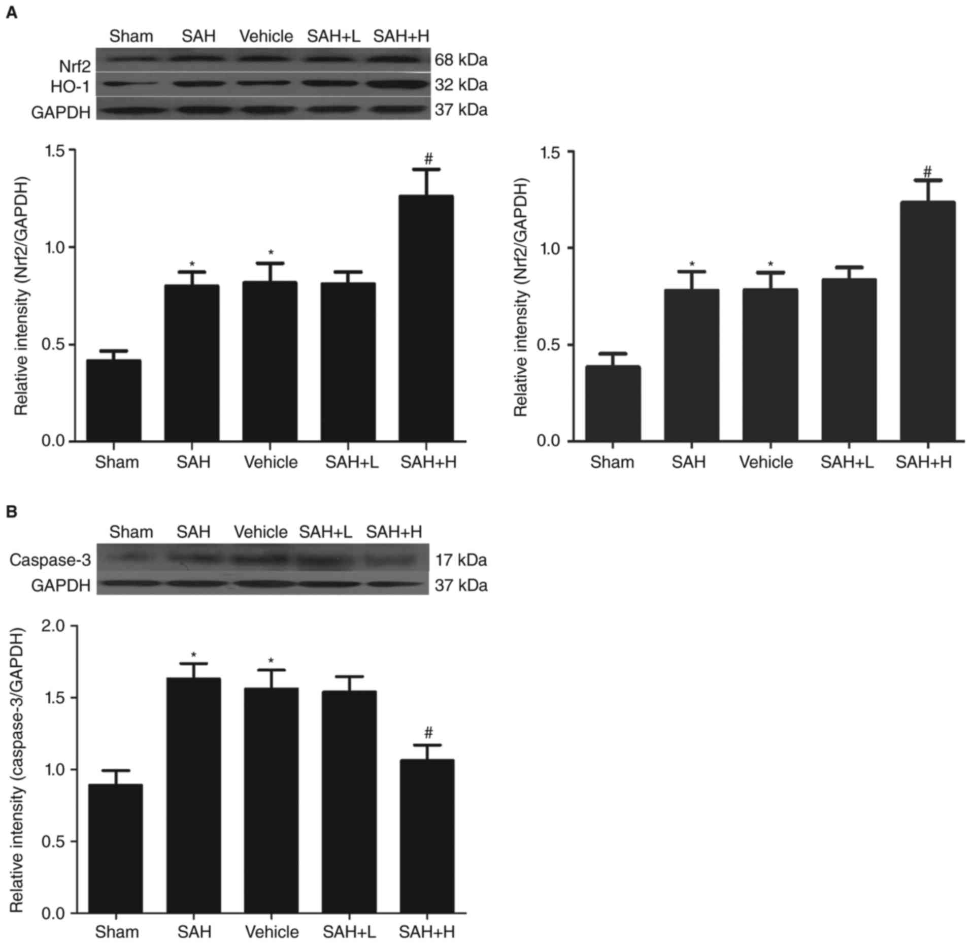 Similarly, compared with the sham group, the expression of caspase-3 was markedly increased in the SAH and SAH + vehicle groups, but this level was significantly downregulated after high dose ALO treatment (P<0.05, Fig. 1B).