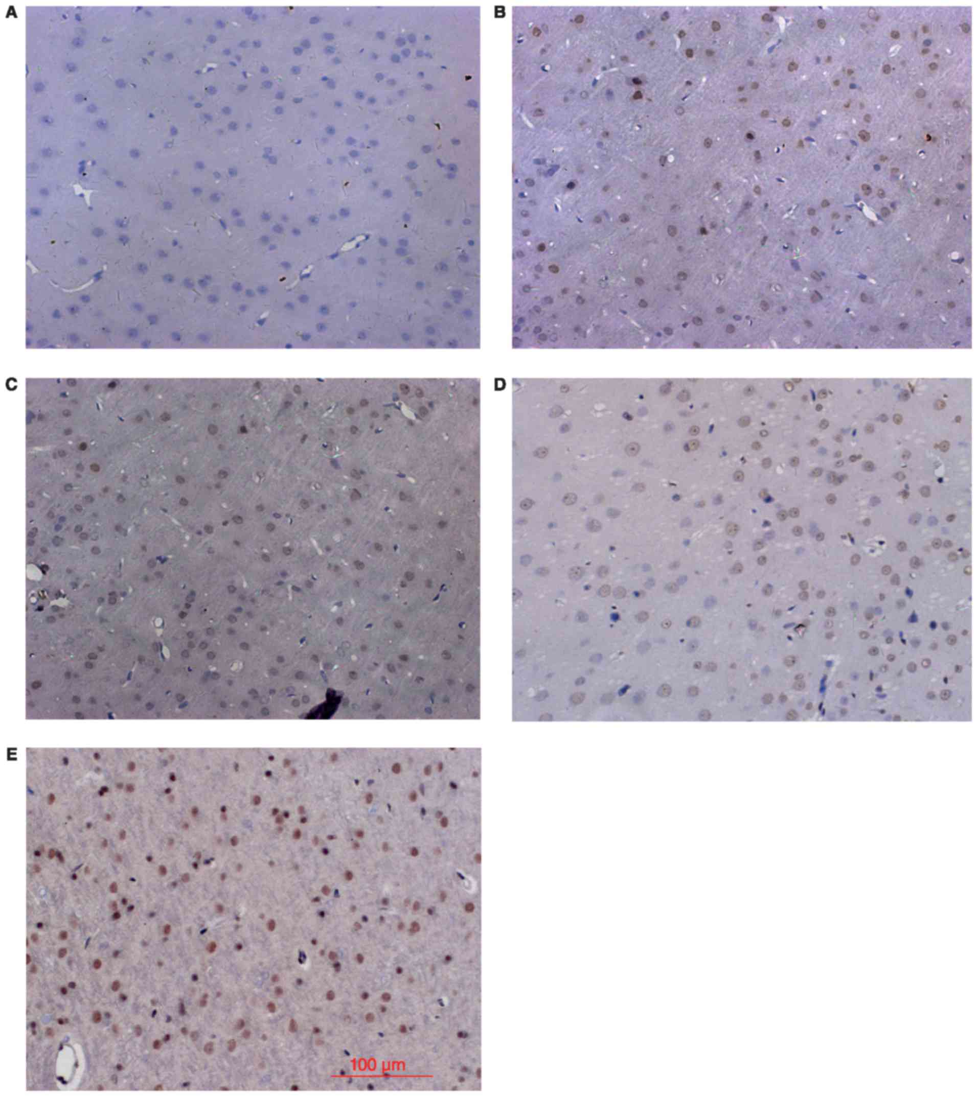Two slides (at least 250 µm apart) per rat were all randomly selected from the cortex of the temporal lobe from each rat brain. Positive cells were identified with the help of an investigator who was blinded to the experimental groupings.