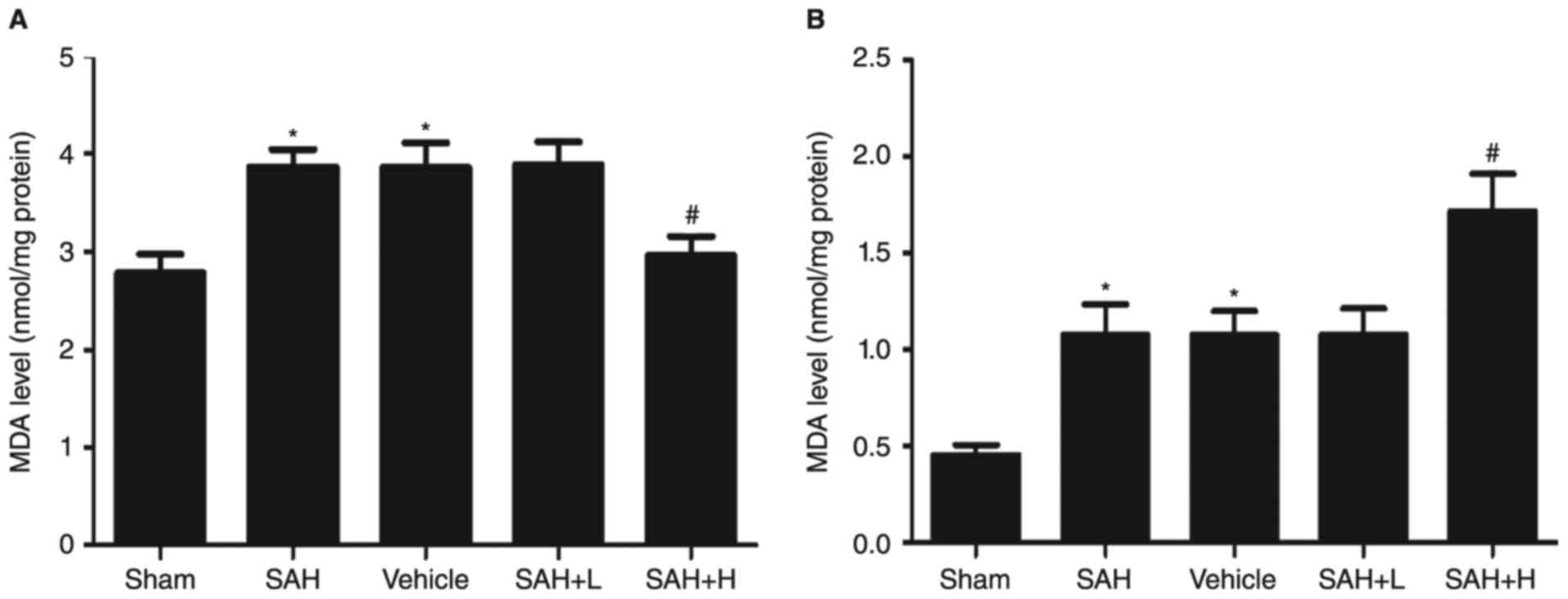 Compared with the sham group, the levels of MDA in the SAH, SAH + vehicle, and SAH+ low concentration ALO groups were obviously increased (P<0.05, Fig. 4A). However, levels were significantly reduced with high concentration ALO treatment in comparison with the SAH + vehicle group (P<0.05, Fig. 4A). Similarly, the enzyme activity of GST-α1 was upregulated following SAH (P<0.05, Fig. 4B). After ALO administration, especially in the high concentration group, the activity was markedly elevated (P<0.05, Fig. 4B), but not in the low concentration group (P>0.05, Fig. 4B).