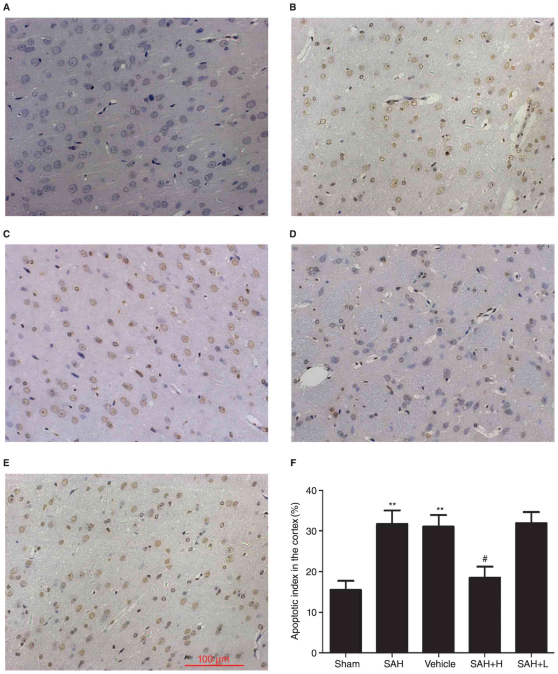 TUNEL-positive apoptotic cells were observed in the temporal lobe with deep brown staining in the nucleus. Few TUNEL positive cells were found in the sham group, and apoptotic index was low (Fig. 5). At 48 h after initial bleeding, the apoptotic index was obviously increased in the SAH and SAH+ vehicle groups in comparison with the sham group (P<0.01, Fig. 5B, C and F). High concentration ALO, but not low concentration ALO treatment, significantly reduced apoptosis in SAH rats, as demonstrated by the low apoptotic index in the SAH + high concentration ALO group (P<0.05, Fig. 5D-F).