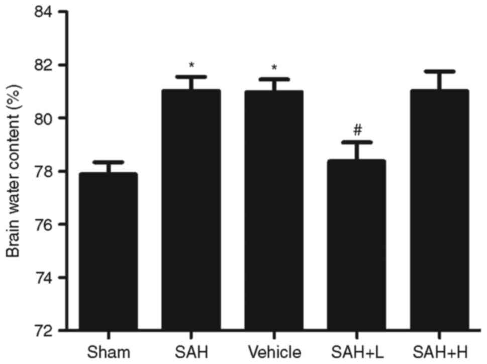 Brains were collected at a time-point 48 h following SAH. The left and right hemisphere brain tissues were immediately weighed (wet weight) and then dried at a temperature of 100°C for 48 h to determine the dry weight. The percentage of water content was calculated with the following formula: [(wet weight - dry weight)/wet weight] ×100% (16).