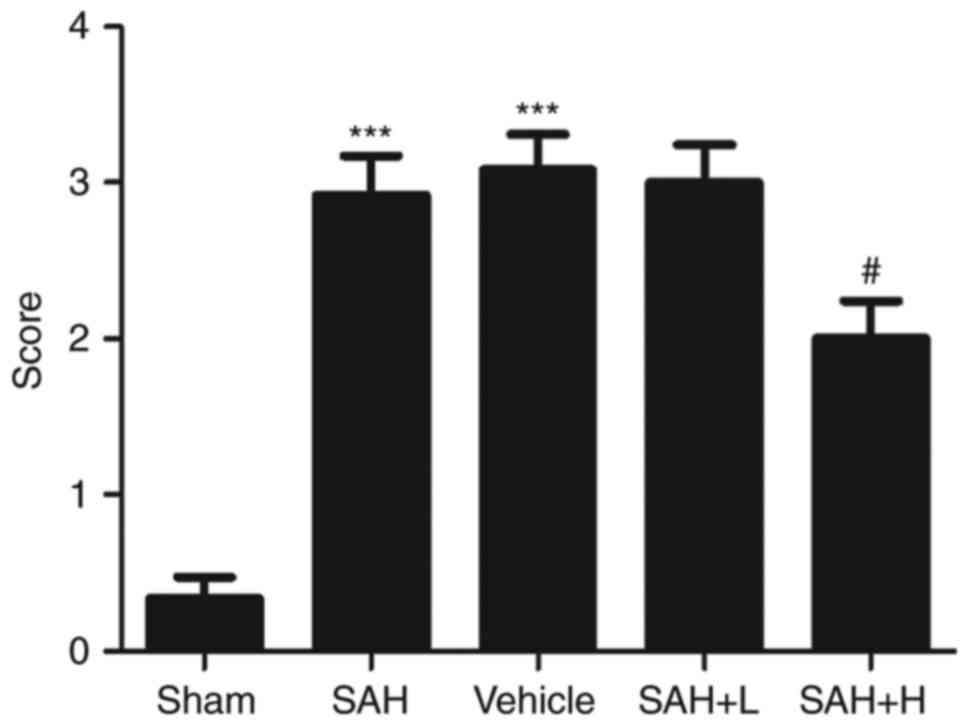 In comparison with the sham group, we found significant impairment of neurological deficit in the SAH and SAH+ vehicle groups at 48 h after SAH (P<0.05; Fig. 7), and there was no difference between the SAH and the SAH+ vehicle groups (P>0.05; Fig. 7). After the high concentration ALO treatment, we observed a better level of neurological function. The neurologic score of the high concentration ALO treatment group was significantly lower than that of the SAH + vehicle group (P<0.05; Fig. 7).