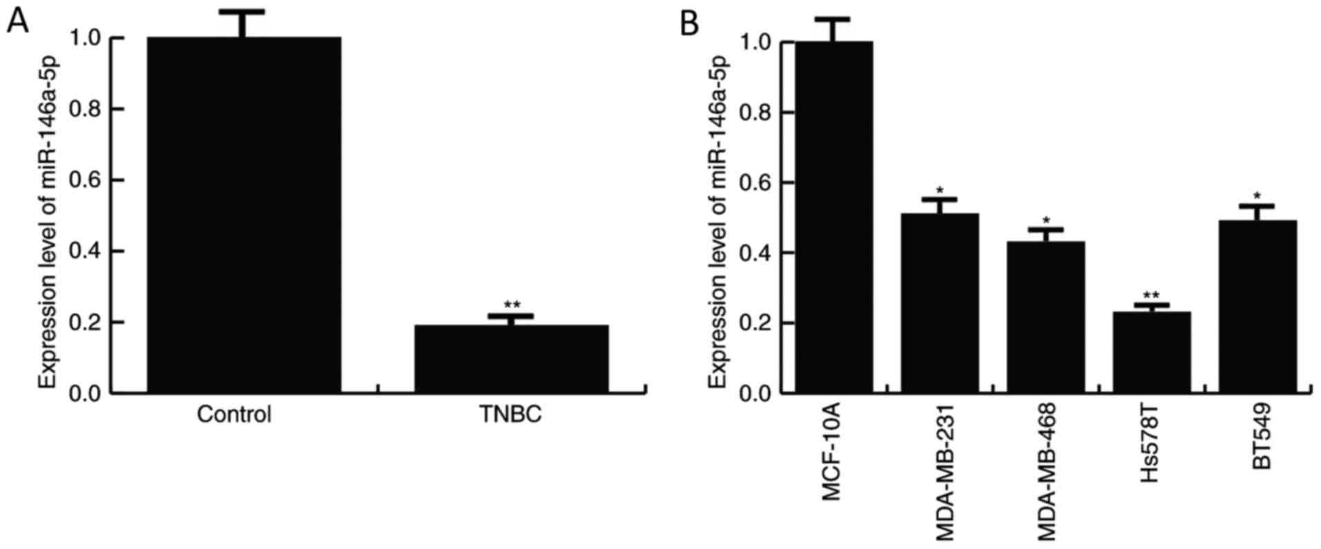miR-146a-5p has been identified as a tumor suppressor in various types of cancer. Zhang et al (20) reported that miR-146a-5p was downregulated in hepatocellular carcinoma and acted as a tumor suppressor. Wang et al (21) revealed that miR-146a-5p promoted esophageal squamous cell carcinoma progression by regulating epithelial-mesenchymal transition (EMT) via targeting Notch2. Furthermore, miR-146a-5p has been confirmed to inhibit non-small cell lung cancer (NSCLC) cell proliferation and cell cycle progression (22). Another study indicated that miR-146a-5p could promote prostate cancer cell apoptosis by targeting ROCK1 (23). However, the function of miR-146a-5p in the development of TNBC remains unclear. Therefore, the present study aimed to investigate the function of miR-146a-5p in TNBC and explore its underlying molecular mechanism.