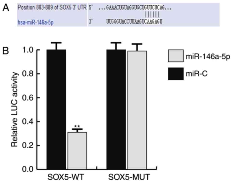 To investigate the mechanisms of the function that miR-146a-5p serves in TNBC, the target gene of miR-146a-5p was predicted using TargetScan, and a dual luciferase assay was performed to verify the prediction. As predicted, it was revealed that miR-146a-5p directly targets SOX5 (Fig. 2).