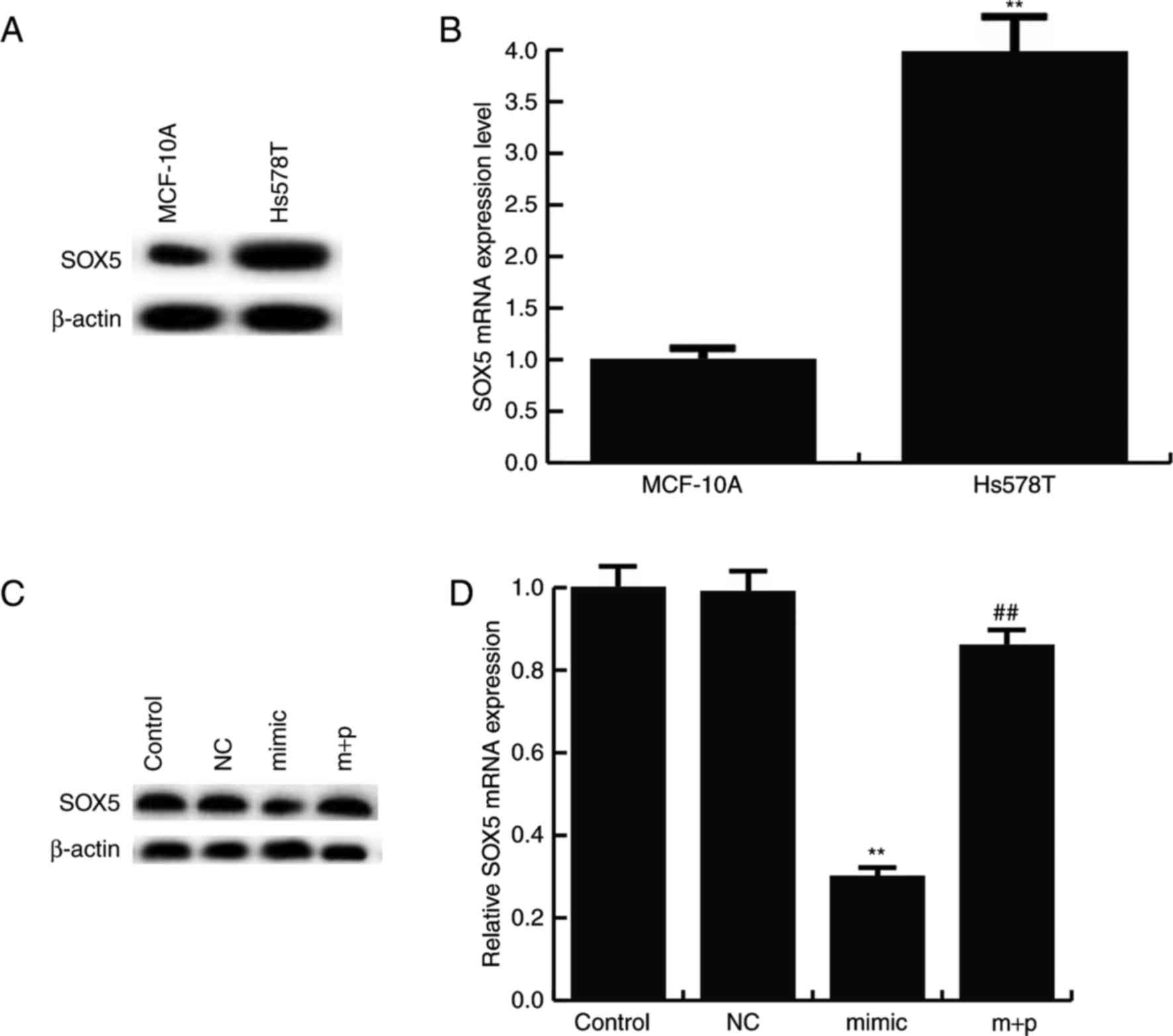 Furthermore, it was revealed that SOX5 protein was expressed at notably higher levels in the TNBC cell line, Hs578T, compared with MCF-10A cells (Fig. 3A). Compared with MCF-10A cells, the mRNA level of SOX5 was significantly increased in Hs578T cells (Fig. 3B). Additionally, it was revealed that miR-146a-5p negatively regulated the protein and mRNA expression of SOX5 in Hs578T cells. miR-146a-5p mimics markedly decreased the SOX5 protein expression, and this decrease was reversed by SOX5-plasmids (Fig. 3C). It was also observed that the mRNA level of SOX5 significantly decreased in miR-146a-5p mimics treated Hs578T cells and this reduction was significantly reversed by SOX5-plasmids (Fig. 3D).