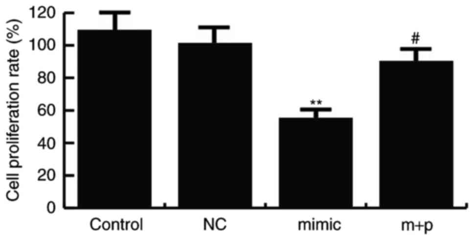 At 24 h after cell transfection, 2.0×103 Hs578T cells/well were plated into a 96-well plate (Corning, Inc., Corning, NY, USA) and incubated for ~24 h at 37°C before treatment. Subsequently, 20 µl MTT (Sigma-Aldrich; Merck KGaA, Darmstadt, Germany) solution (5 mg/ml) was added to each well, and then incubated for another 4 h at 37°C. Intracellular formazan crystals were dissolved using dimethyl sulfoxide (Sigma-Aldrich; Merck KGaA). At the end of the test, cell proliferation ability was determined by detecting the absorbance at 490 nm using a microplate reader.