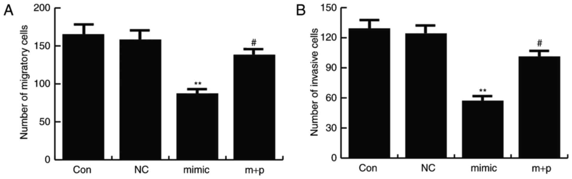 To determine cell invasion and migration ability, a Transwell assay was performed 24 h after cell transfection using Transwell inserts (Corning Incorporated, Corning, NY, USA). For the invasion assay, a membrane coated with Matrigel (BD Biosciences, Franklin Lakes, NJ, USA) was used to construct a matrix barrier. Next, 5×104 Hs578T cells were seeded into the upper chamber containing 200 µl serum-free DMEM medium and 0.1% bovine serum albumin (Thermo Fisher Scientific, Inc.). In total, 500 µl medium supplemented with 15% FBS was added into the lower chamber. For the migration assay, Hs578T cells were incubated for 24 h at 37°C, and for the invasion assay, the cells were incubated for 48 h at 37°C. Cells on the upper membranes were wiped away, and the migrated or invasive cells on the lower membranes were firstly fixed with 95% ethyl alcohol for 15 min at room temperature and then stained with 0.1% crystal violet for 15 min at 37°C. At the end of the experiment, the cells were counted under an inverted light microscope (Olympus Corporation, Tokyo, Japan) using ImageJ software version 1.48u (National Institutes of Health, Bethesda, MD, USA).