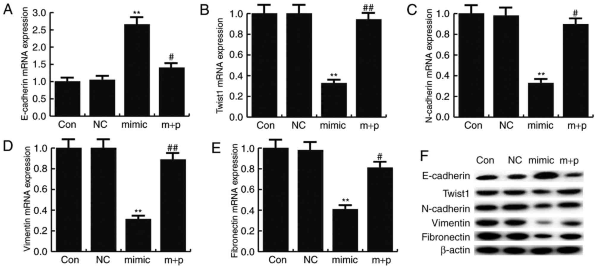 To determine the effect of miR-146a-5p on TNBC cell EMT, the expression levels of mesenchymal markers (N-cadherin, vimentin and fibronectin) and an epithelial marker (E-cadherin) were detected by RT-qPCR and western blotting. The results revealed that miR-146a-5p mimics significantly reduced the mRNA expression of N-cadherin, vimentin and fibronectin compared with the control, but significantly enhanced the mRNA level of E-cadherin (Fig. 6A-E). Similar results were obtained from western blot analysis (Fig. 6F). These effects could be significantly reversed by SOX5 overexpression. A previous study revealed that SOX5 could induce EMT by regulating Twist1 expression (25). In the present study, the data indicated that miR-146a-5p mimics significantly decreased Twist1 expression compared with the controls, and this decrease could be significantly reversed by SOX5 overexpression (Fig. 6).