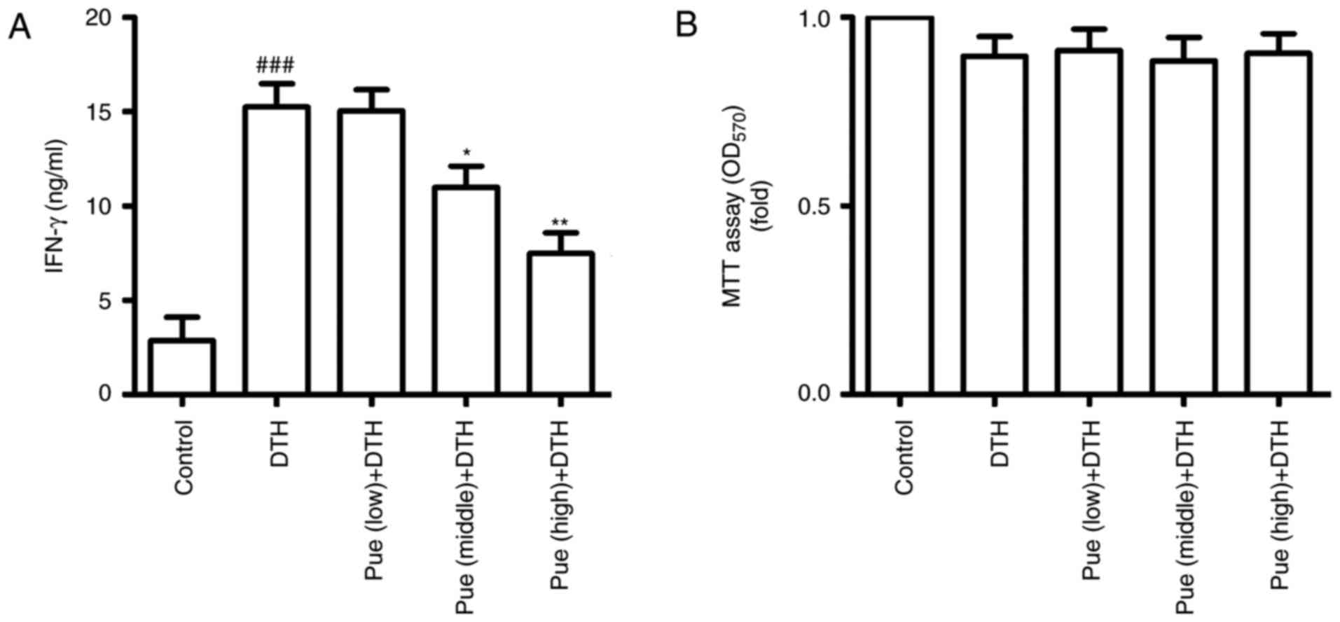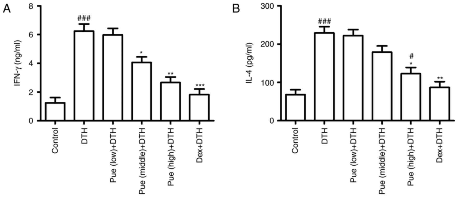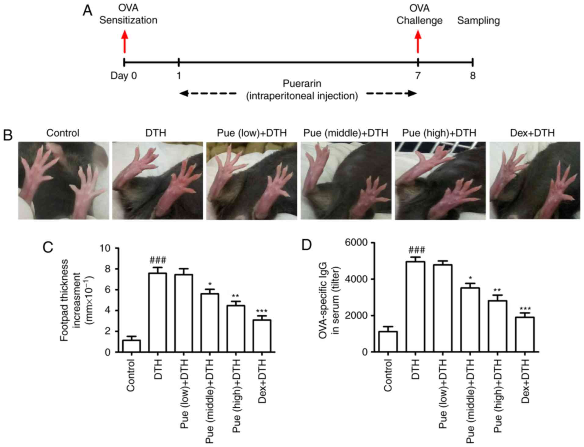 48 Mice were randomly assigned to six different groups: Control group (not immunized), DTH group (OVA-induced DTH), Puerarin (Pue) + DTH group (low-, middle- and high-dose puerarin was used during repeated OVA application, respectively), Dexamethasone (Dex) + DTH group (dexamethasone treatment during repeated OVA application).