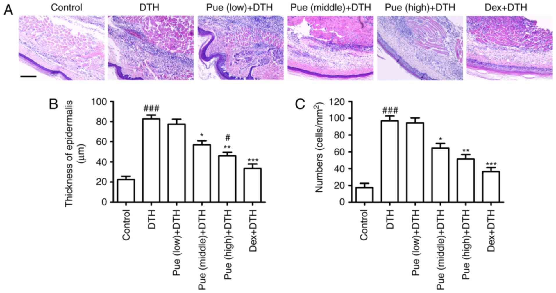 Inflammatory cells were evidently increased following OVA-challenge in the dermal tissue (Fig. 2). Compared to the DTH group, puerarin evidently inhibited the increment of epidermis thickness (Fig. 2B) and reduced inflammatory cell infiltration (Fig. 2C), which diminished the number of inflammatory cells recruited to the footpad associated with the local inflammation.