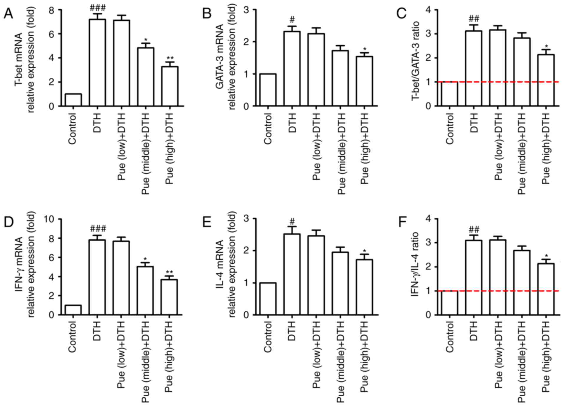 Lastly, the effect of puerarin on the transcription factors such as T-bet and GATA-3 were investigated, which directly or indirectly regulate Th1 and Th2 differentiation. As shown in Fig. 5A-C, middle and high concentration of puerarin inhibited the expression of T-bet in mRNA level, whereas only high dose of puerarin showed suppressive effect for GATA-3 (Fig. 5A-C). In addition, the similar tendency was found for the expression of IFN-γ and IL-4 in the molecular level (Fig. 5D-F). Compared with that in the control group, the expression of T-bet protein was clearly increased in the DTH group. However, high dose of puerarin significantly reduced the level of T-bet and GATA-3 protein (Fig. 6A and B). These results suggest that puerarin could regulate a shift of Th1 polarization to Th1/Th2 balance, which is related to the decrement of T-bet in mRNA and protein levels and subsequently inhibitive IFN-γ production.