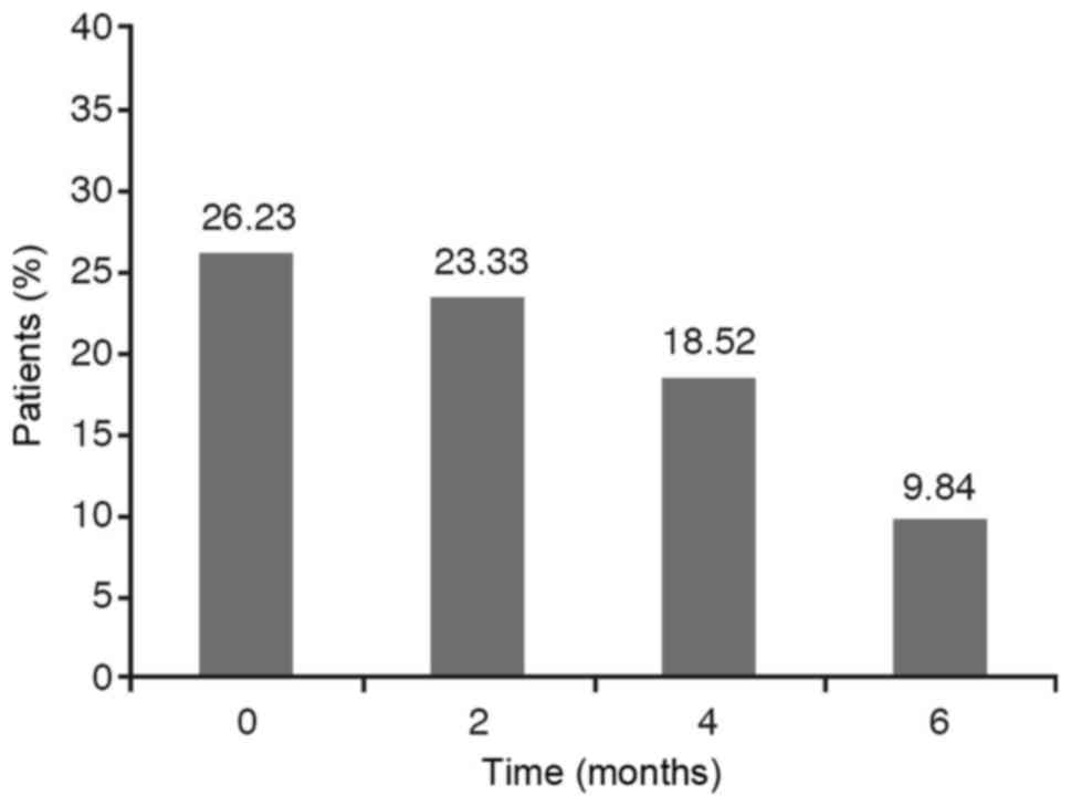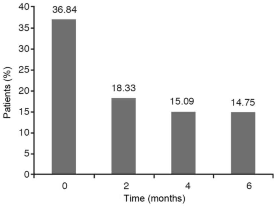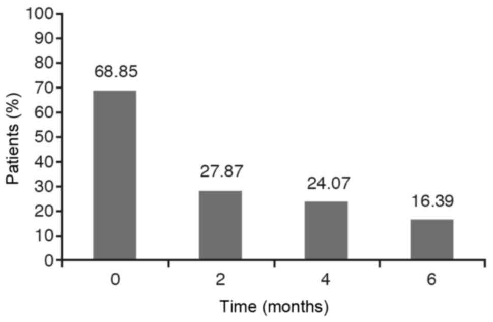 With respect to the contrast in the acute asthma crisis (with a P-value slightly above 0.05) the conclusion is that these percentages are statistically different between initial stage and after 6 months of treatment (Fig. 4).