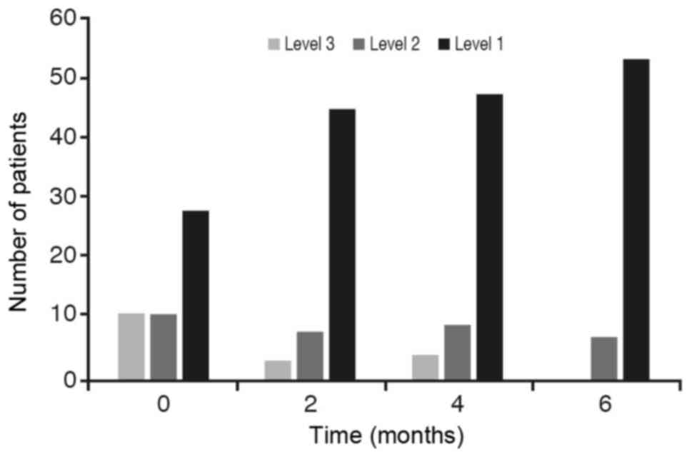 The data has been taken from 61 patients over 6 months. The variables described before have been valued specifically at the start of the study (time 0), at 2 months (time 2), at 4 months (time 4), and at 6 months (time 6). Depending on the nature of the variable, two types of analysis have been carried out.