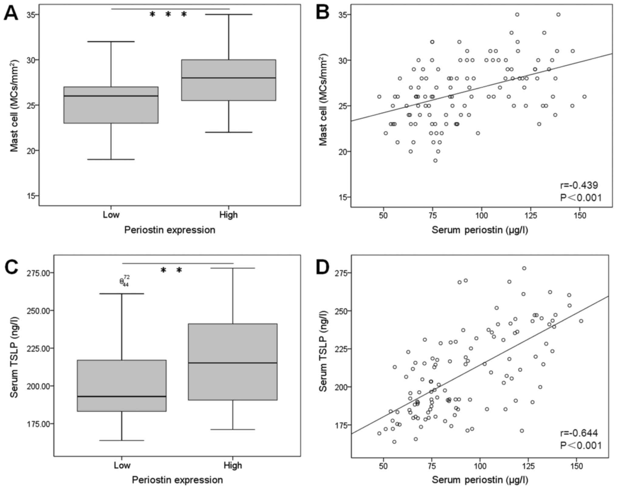 The serum concentration of TSLP was significantly higher in patients with periostin-high than those with periostin-low (P<0.01; Fig. 4C). There was positive correlation between the serum periostin level and TSLP in OLP subjects (r=0.644, P<0.001; Fig. 4D).