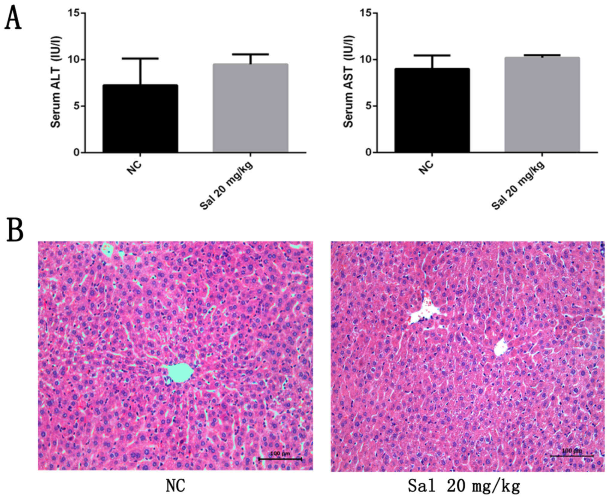 To exclude any potential detrimental effects of Sal treatment, liver enzymes and hemotoxylin and eosin (H&E)-stained liver sections were examined after exposure to Sal at 20 mg/kg for 24 h. As indicated in Fig. 1A, serum ALT and AST levels did not differ between the Sal-treated and NC groups. As indicated in Fig. 1B, treatment with 20 mg/kg Sal did not cause obvious necrosis or inflammation in H&E-stained sections. These findings indicate that Sal has no adverse effect on liver function or the inflammatory response in mice.