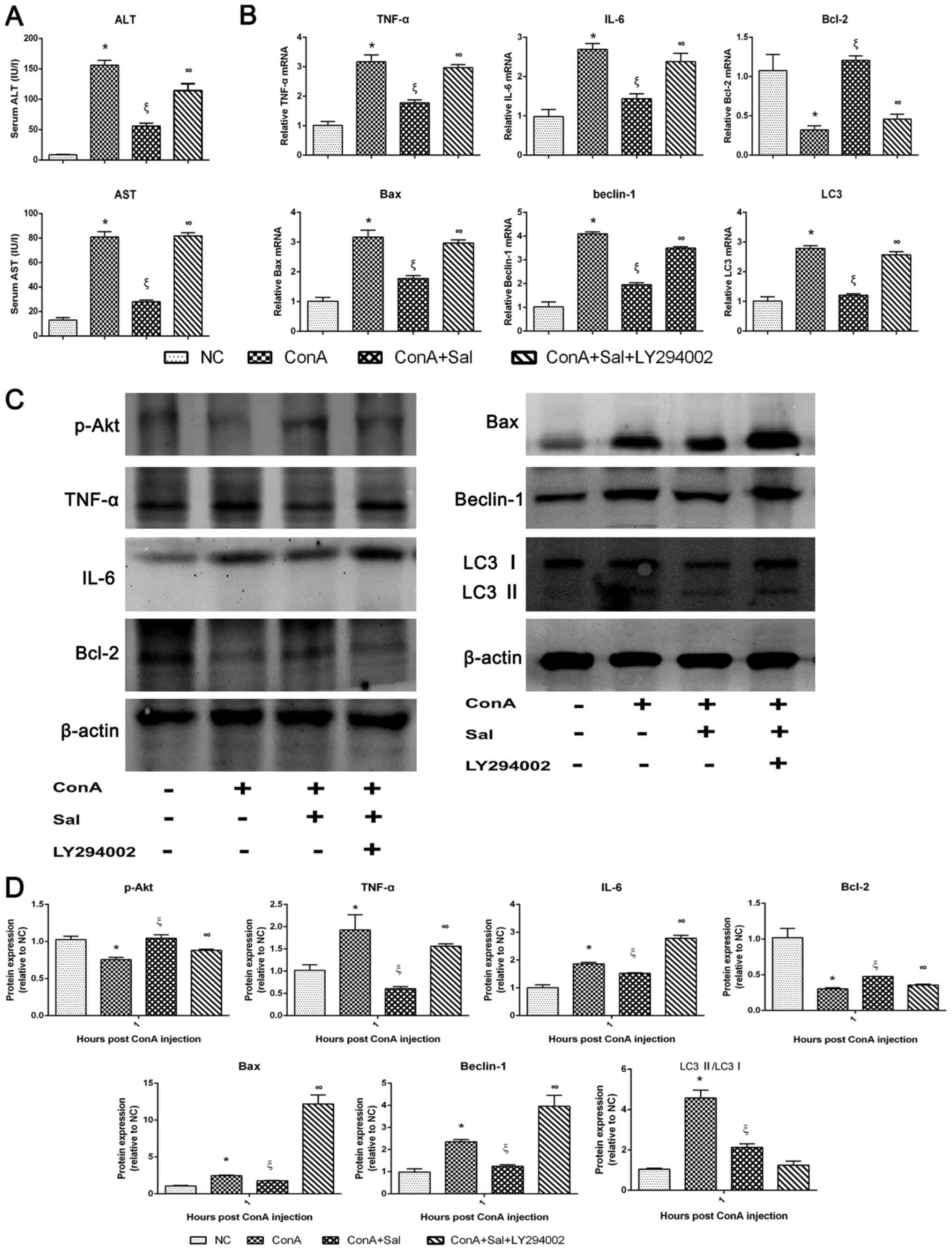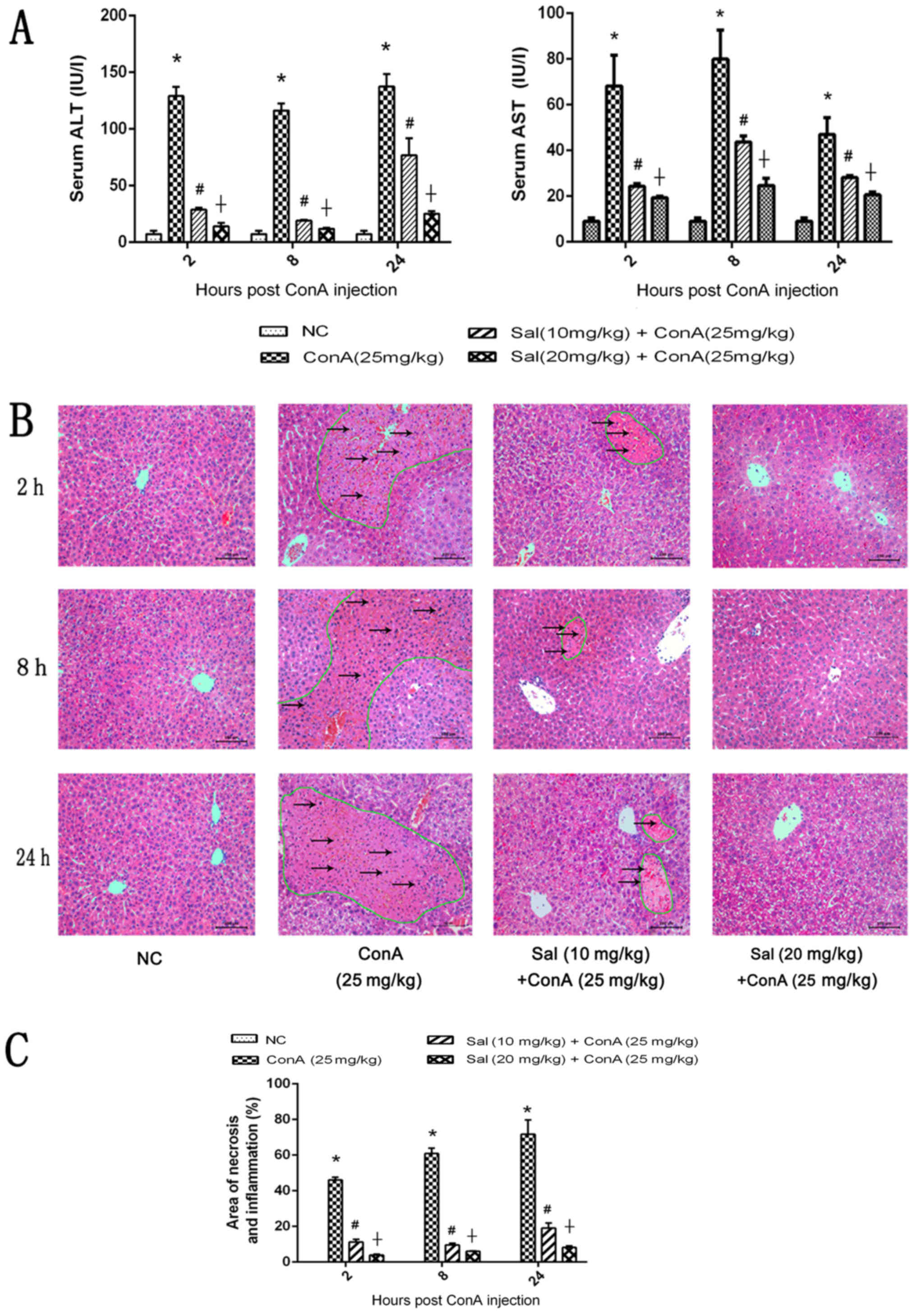 Based on these previous findings, in the present study, the protective effect of Sal on ConA-induced liver injury was investigated in mice and its underlying mechanisms were explored. It was hypothesized that Sal ameliorates ConA-induced liver injury by modulating inflammation, apoptosis and autophagy through the phosphoinositide 3-kinase (PI3K)/Akt pathway.