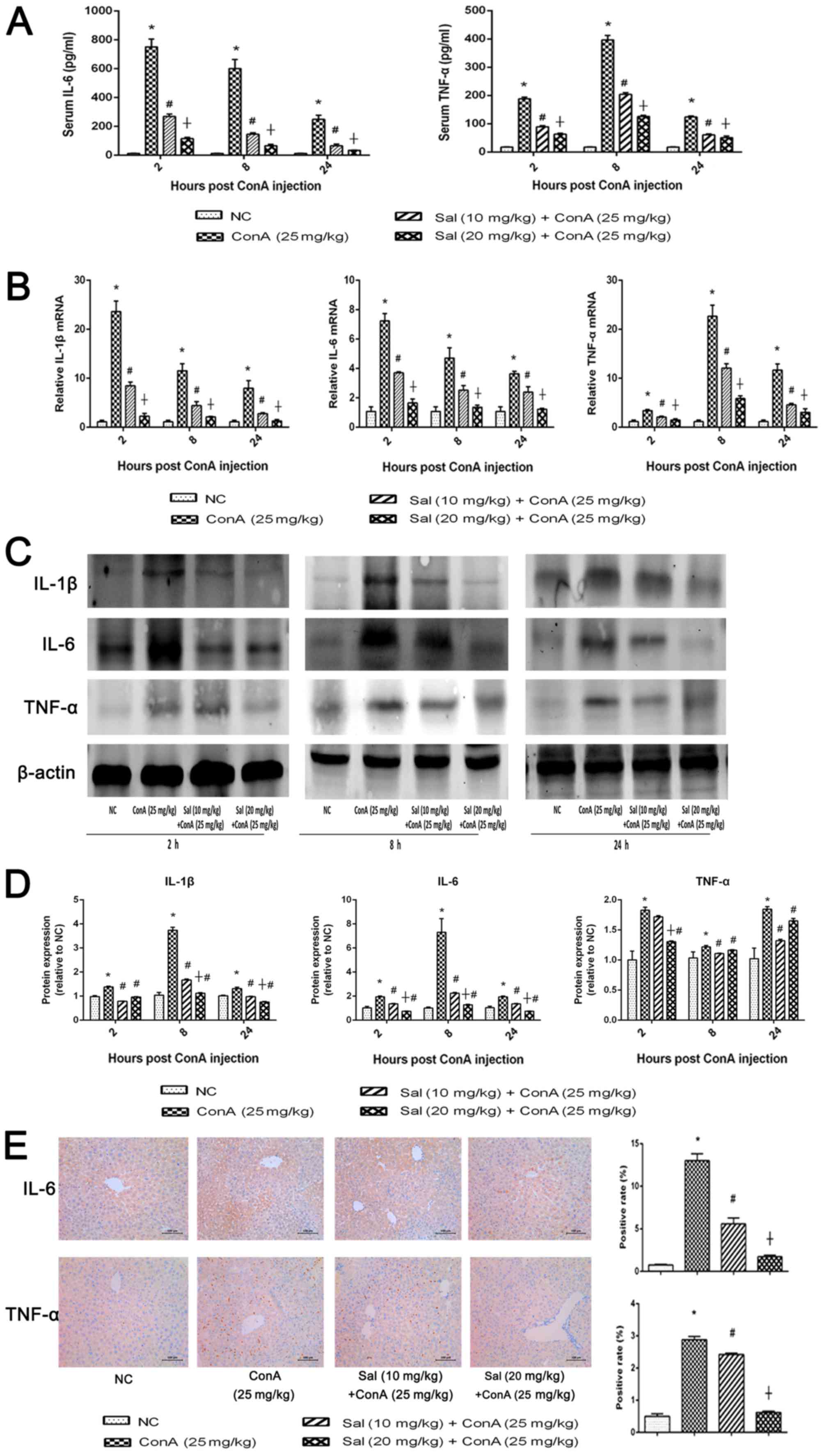 ConA may induce hepatitis, which not only results in inflammatory infiltration in liver tissues, but also increases the levels of pro-inflammatory cytokines in the serum, including IL-1β, IL-6 and TNF-α (13). Therefore, in the current study, the degree of inflammation was detected by measuring the serum levels of IL-6 and TNF-α, the mRNA and protein levels of pro-inflammatory cytokines in liver tissues, and the histochemical pro-inflammatory cytokine expression. The serum levels of IL-6 and TNF-α were significantly increased in the ConA group compared with the control. Out of the three detected time points, the serum IL-6 levels were highest at 2 h after ConA injection, while TNF-α levels were highest at 8 h after ConA injection (Fig. 3A). Sal pretreatment significantly reduced the serum levels of IL-6 and TNF-α compared with ConA treatment alone, particularly at 20 mg/kg Sal. The results of qPCR and western blot analyses were similar to those of ELISA regarding the mRNA and protein expression of IL-1β, IL-6 and TNF-α (Fig. 3B-D). In the majority of cases Sal (20 mg/kg) was more effective at reducing the expression of the inflammatory cytokines in liver tissues compared with Sal (10 mg/kg). However, as for TNF-α expression, the statistical analysis of western blot at 8 and 24 h revealed that Sal 10 mg/kg exhibited a stronger protective effect. These results may due to the possibility that Sal (at a higher dosage) may lead to the inhibition of apoptosis and autophagy of hepatocytes, therefore the injured but not dead cells induced an excessive secretion of TNF-α in liver tissues. Immunohistochemical staining was used to determine the expression of IL-6 and TNF-α (Fig. 3E), and the results were consistent with those of ELISA, qPCR and western blot analyses. These results provided strong evidence that pretreatment with Sal may reduce the release of inflammatory cytokines, including IL-1β, IL-6 and TNF-α, in ConA-induced liver injury at the transcriptional and translational levels.